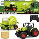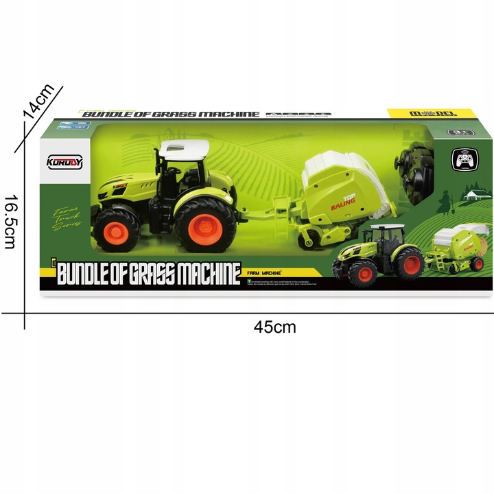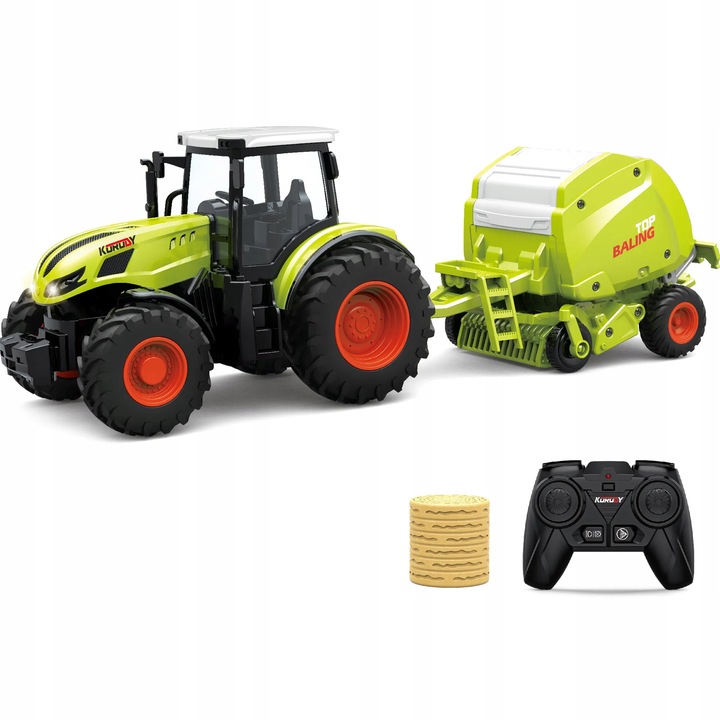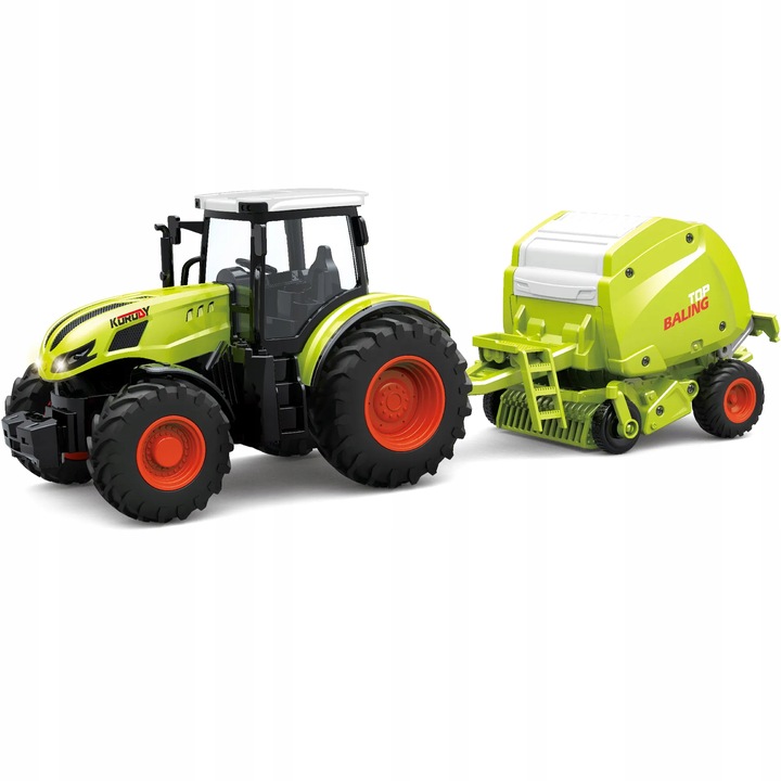 Tractorul reproduce fidel echipamentele agricole moderne, cu un finisaj meticulos: roti din cauciuc, lumini stralucitoare in timpul functionarii, si o presa de balotat detasabila.