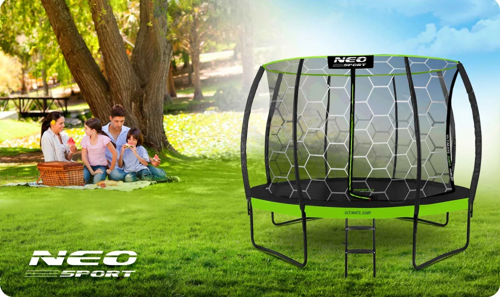 Trambulina de gradina pentru copii Neo-Sport Comb Verde 312cm 10FT,cu Scara si Plasa interioara, Stalpi metalici cu protectie din burete, Intrare cu fermoar si catarama, Covoras impermeabil flexibil