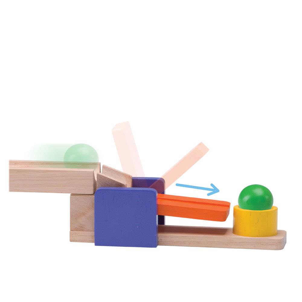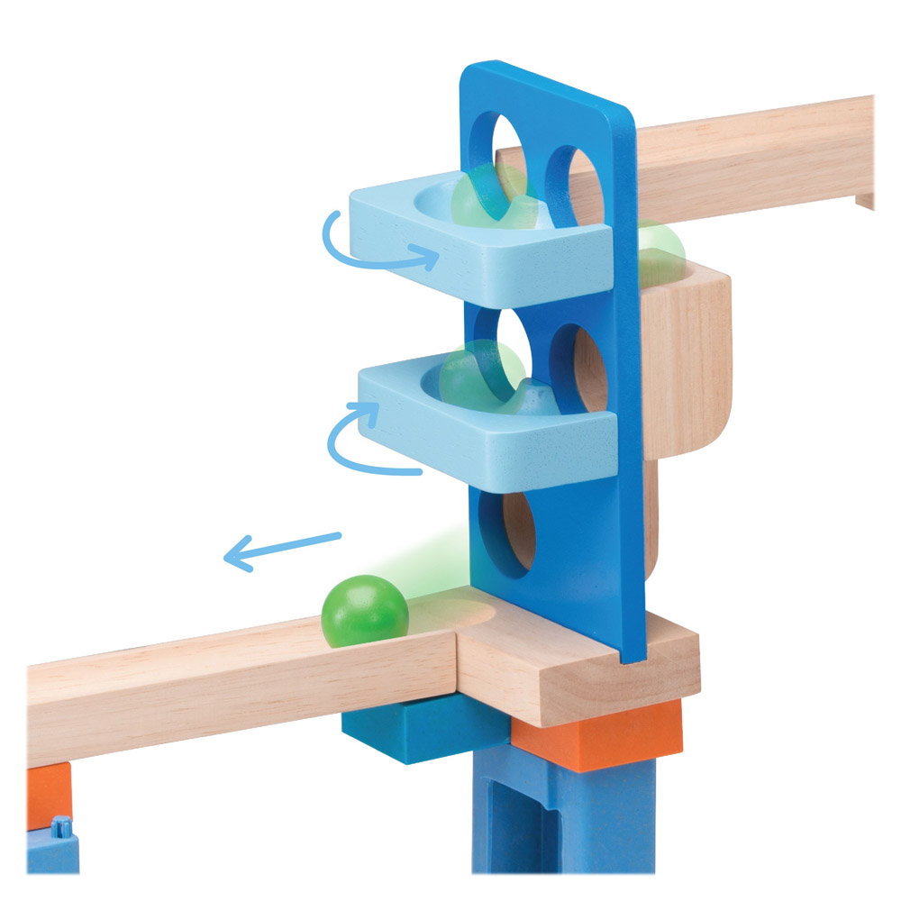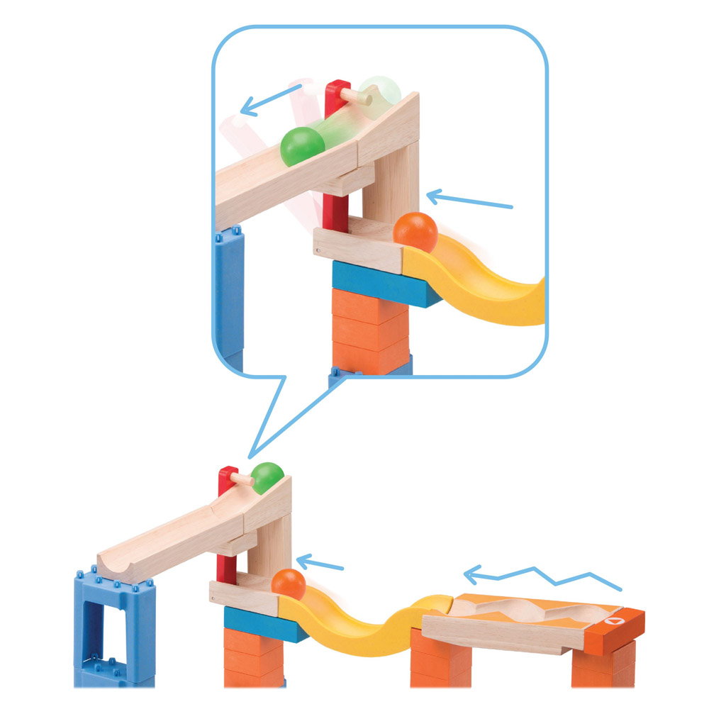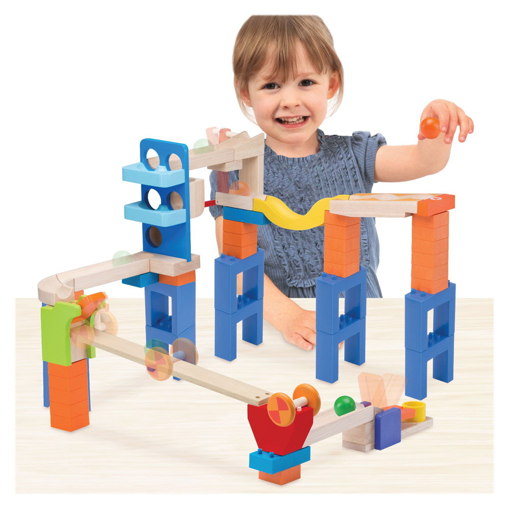 • Acest set creativ cu bile si segmente de pista din lemn este mai mult decat un traseu clasic pentru bile, avand obstacole captivante si distractive si un sistem de blocare a caramizilor care va mentine creatiile stabile, in timp ce se construieste traseul.