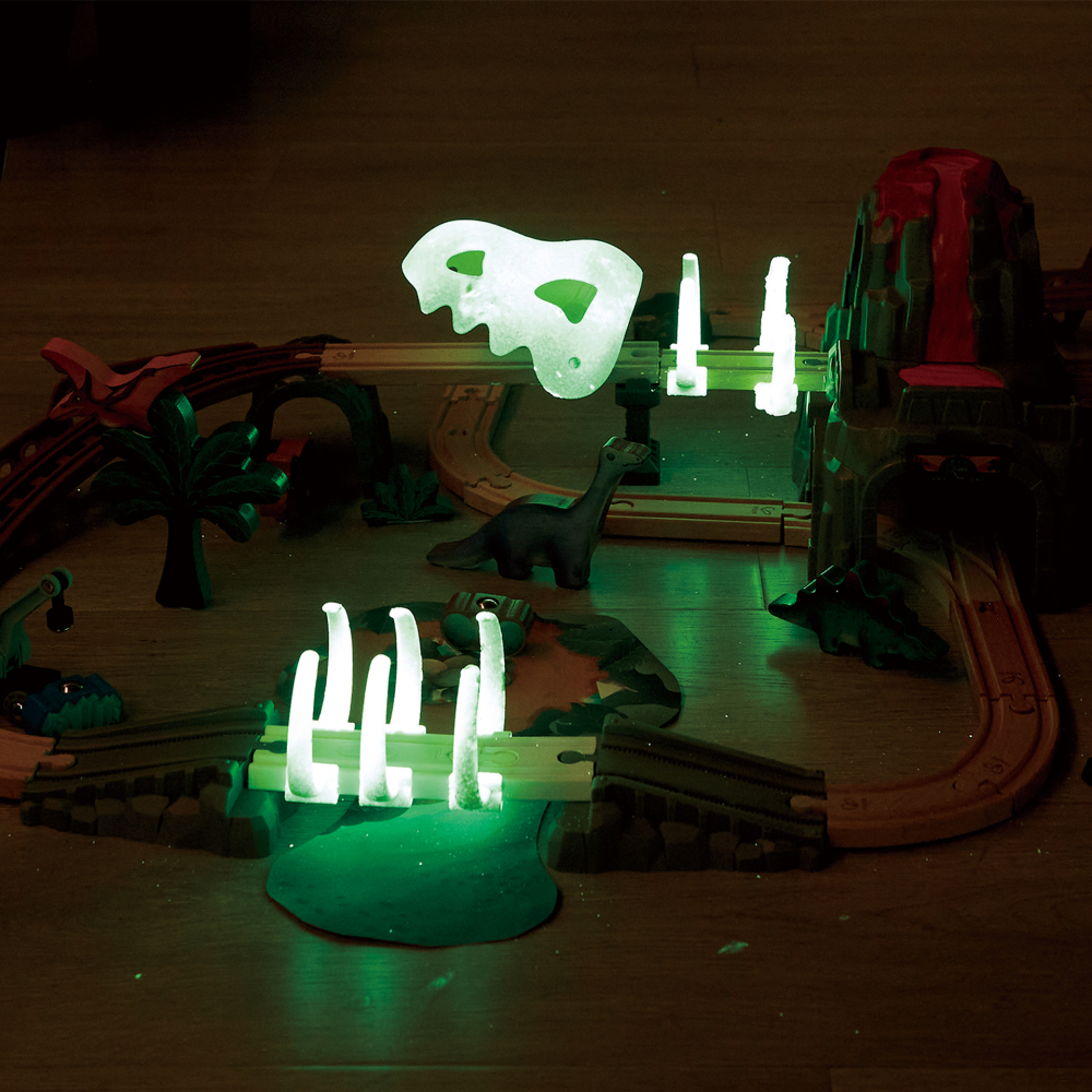 Exista o multime de elemente interactive pentru a mentine copiii implicati, de exemplu, craniul si oasele de dinozaur sunt realizate din material plastic special care poate straluci in intuneric. In plus, craniul de dinozaur se ridica, macaraua transporta marfa la tren, iar cand un tren trece prin cutia toracica, vei auzi efecte sonore interesante.