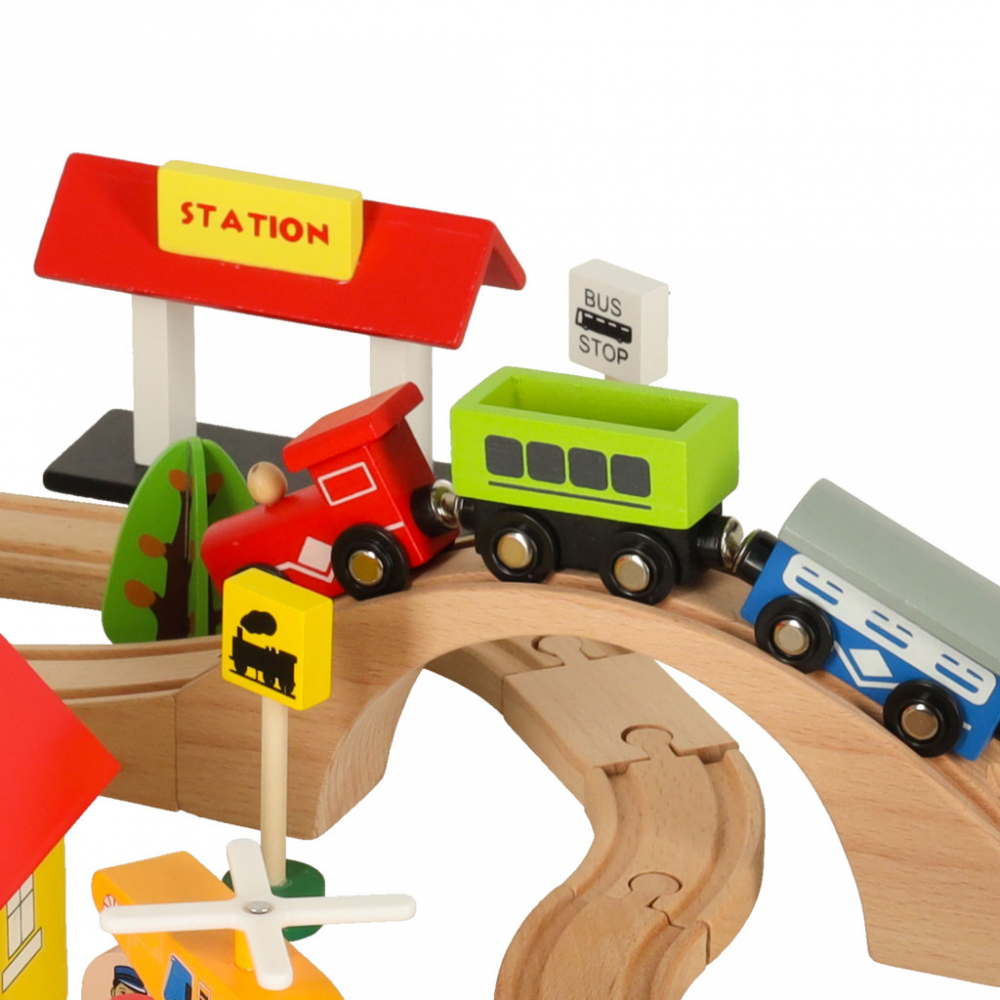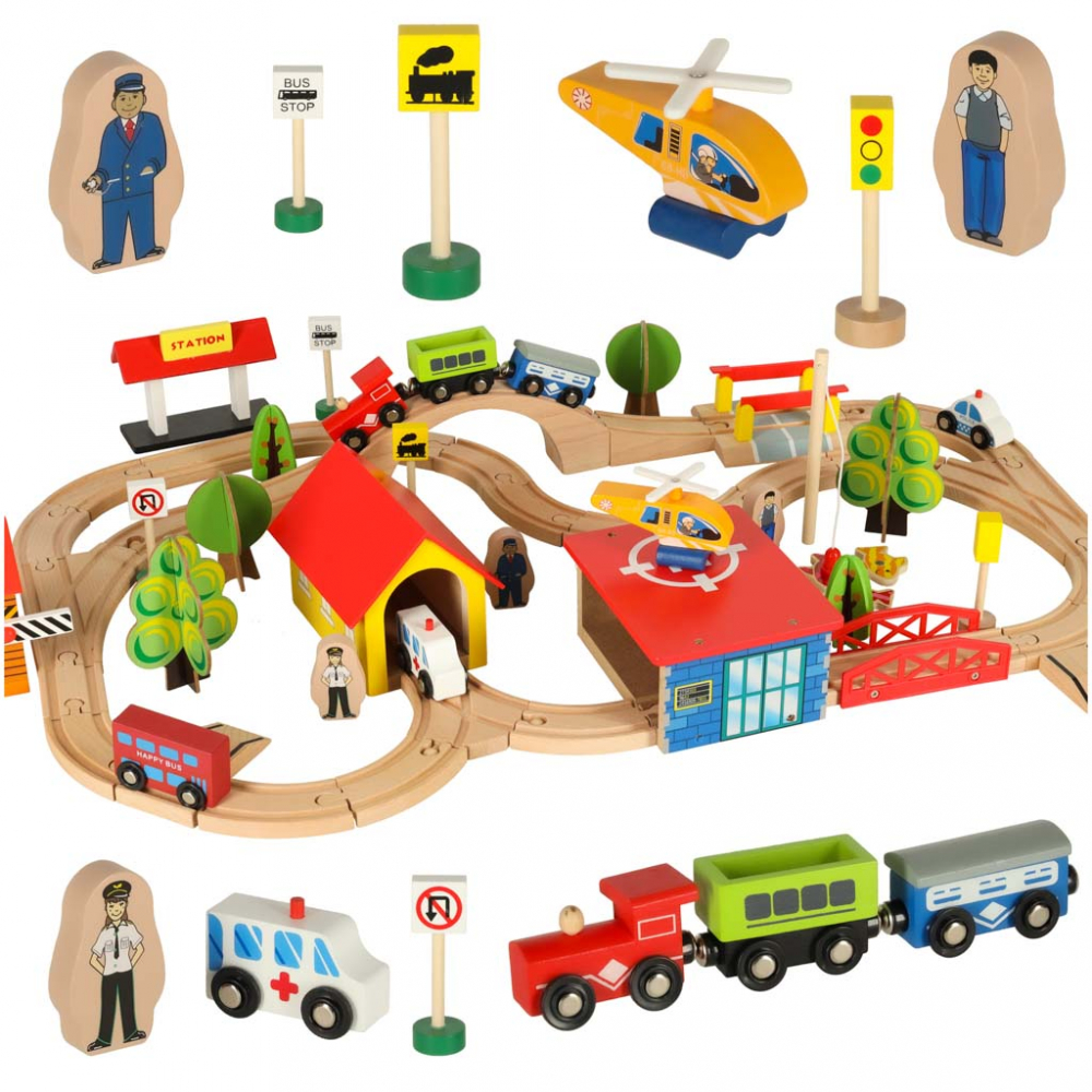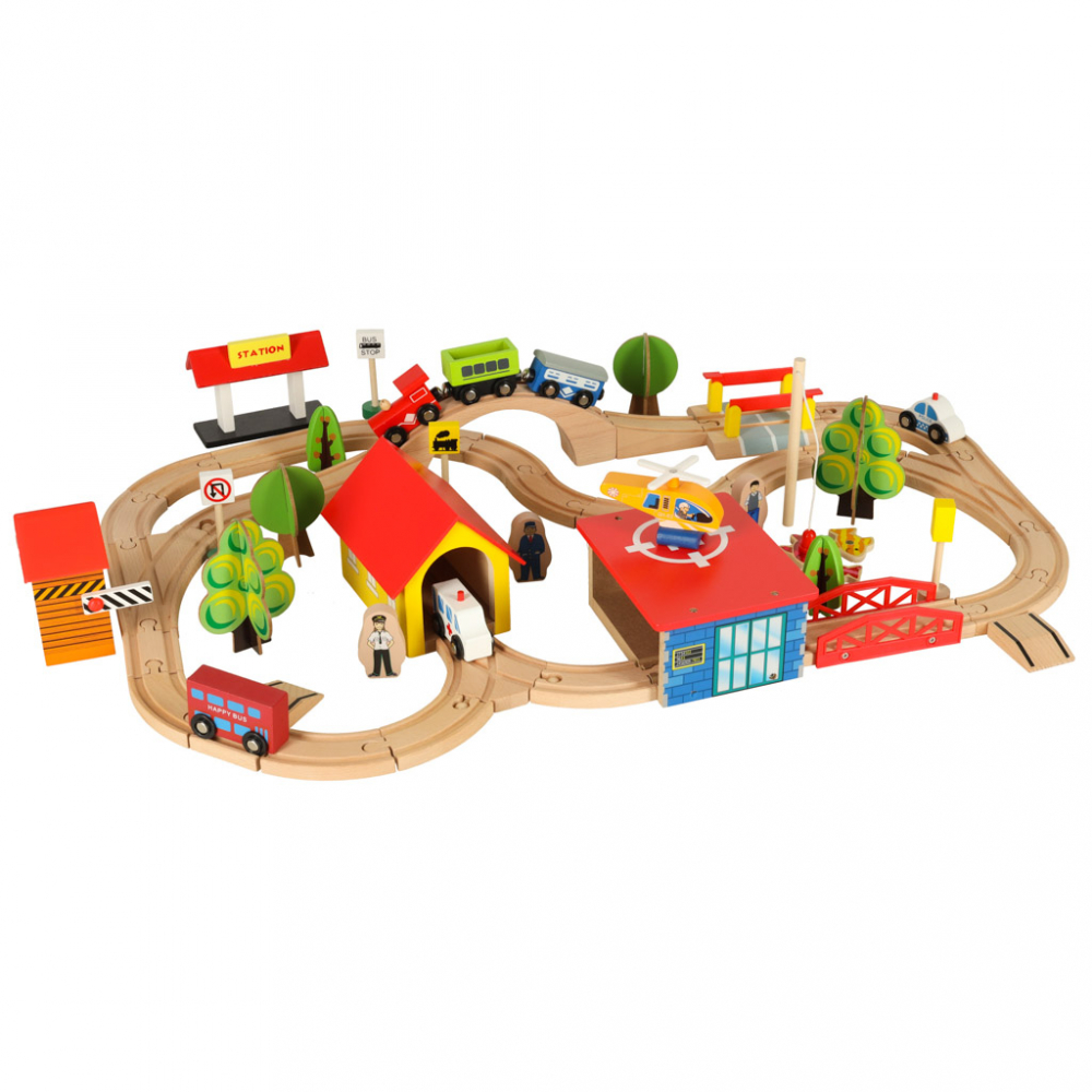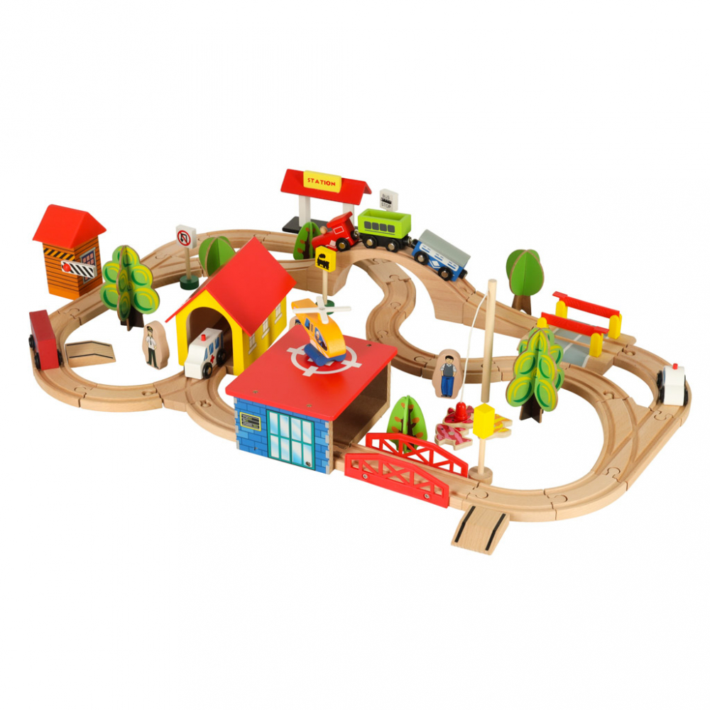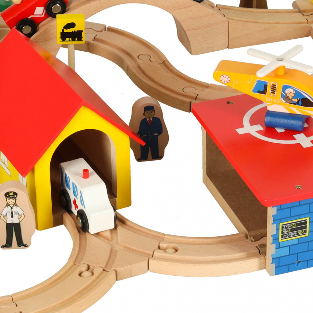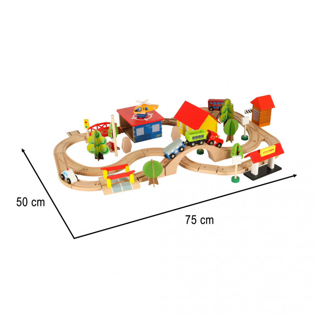 Trenulet din lemn pentru copii City, compus din 69 de elemente, dimensiune montat 75 x 50 cm