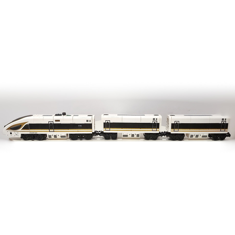 Trenulet electric alb/galben pentru calatori Victor din piese de constructie