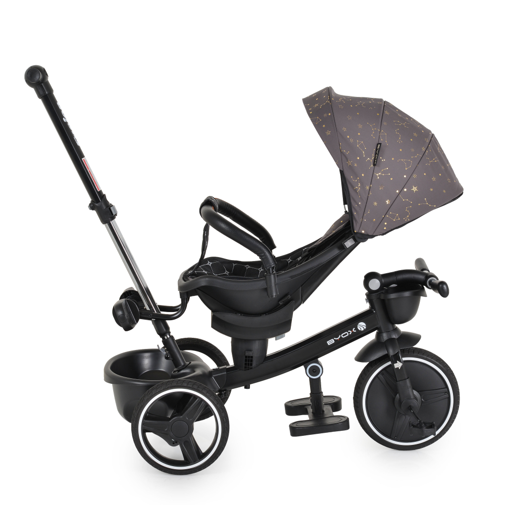 Tricicleta pentru copii Byox Fusion Grey,maner parental reglabil pe inaltime,scaun rotativ la 360 grade,spatar reglabil cu pozitie somn,ghidon pliabil,roti din PU,frana,husa moale,2 tipuri de suport picioare,bara detasabila