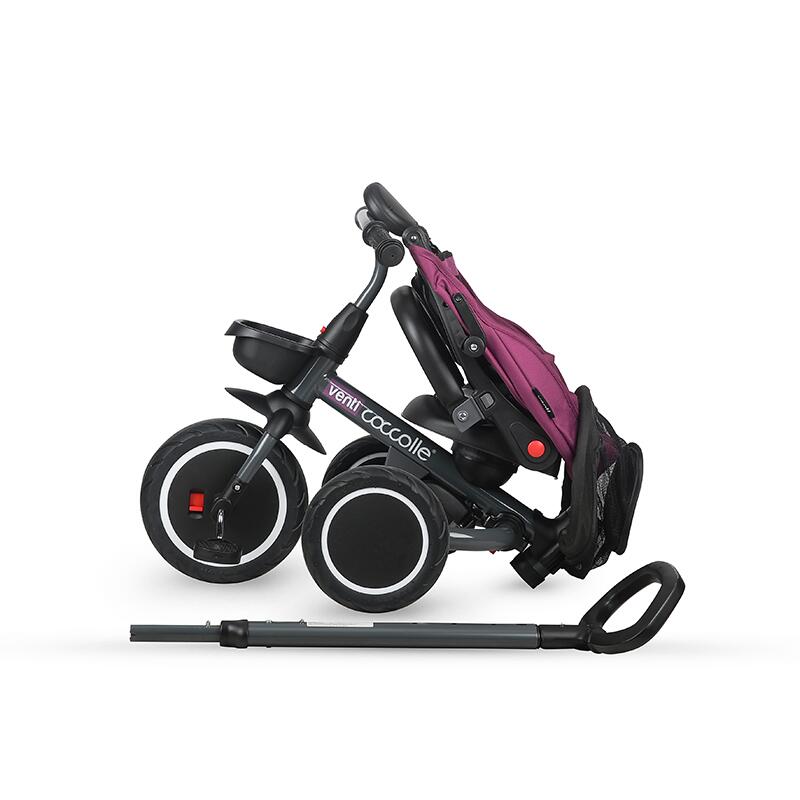 Tricicleta pentru copii Coccolle Venti Magenta multifunctionala, cu spatar ajustabil, cu pozitie de somn, sezut rotativ 360 grade, roti de cauciuc, 2 seturi de suporti de picioare de la 10 luni pana la 25 kg