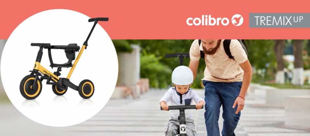 Tricicleta pentru copii Colibro Tremix Up Banana Ride On 5 in 1 transformabila, cu maner, scaun reglabil pe inaltime, maner detasabil