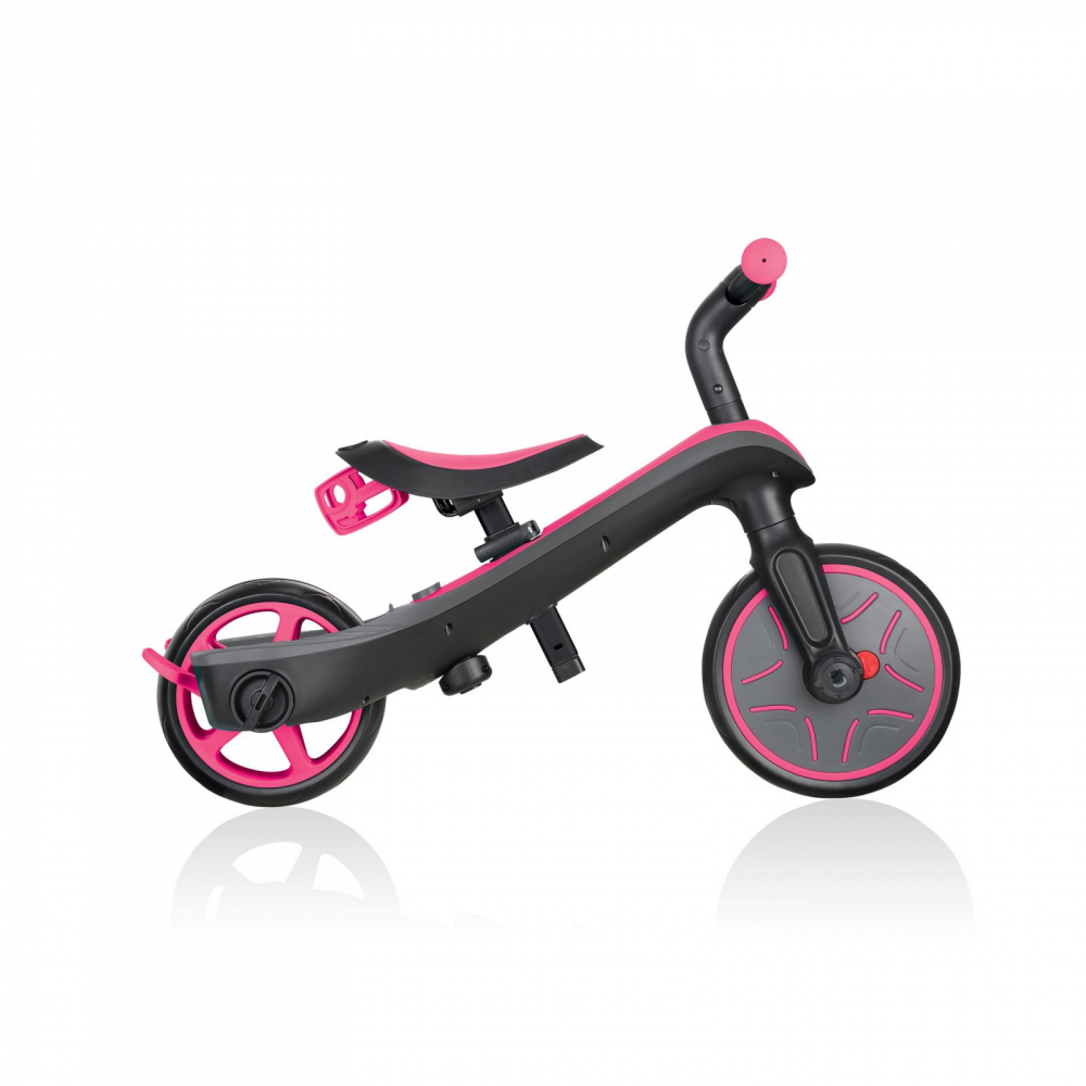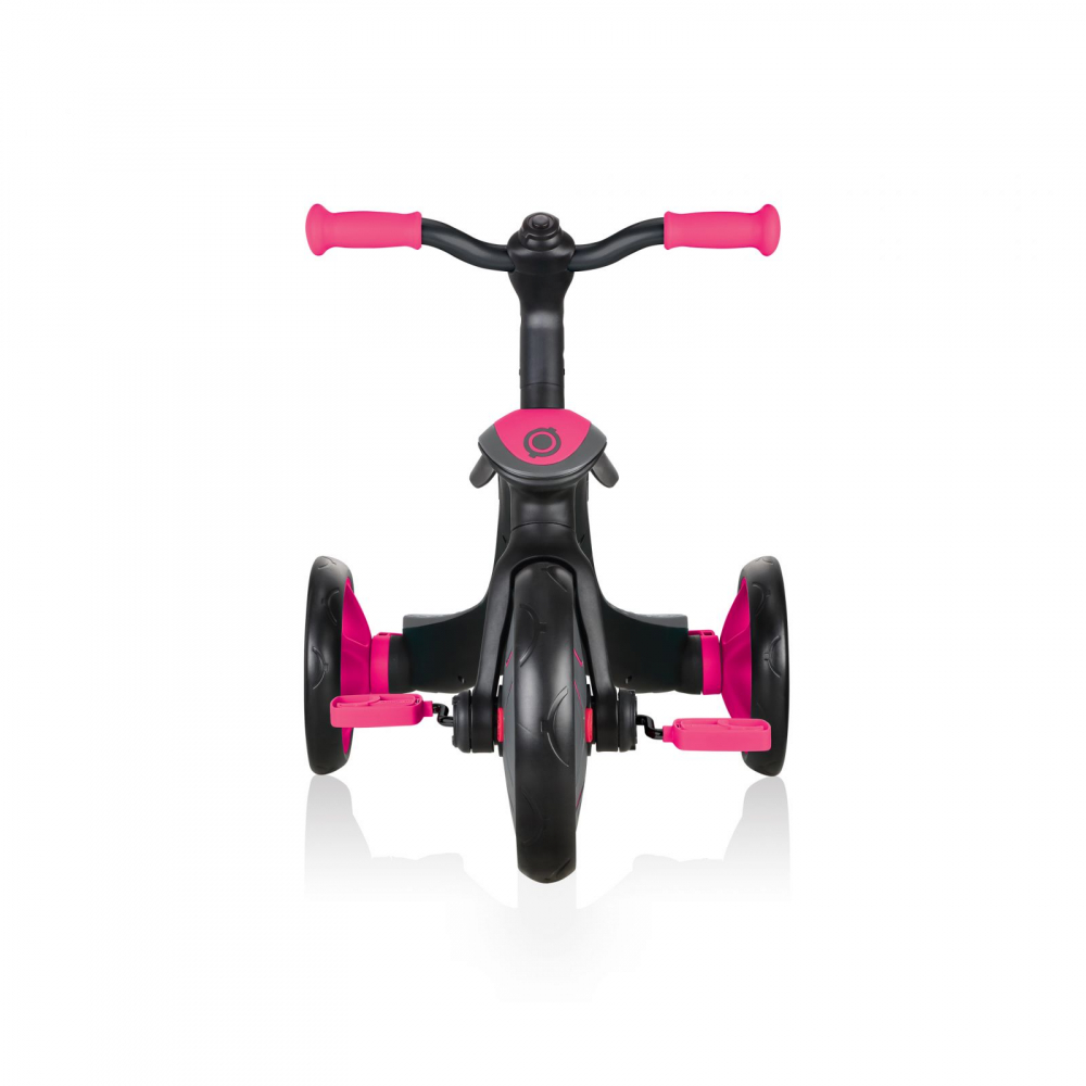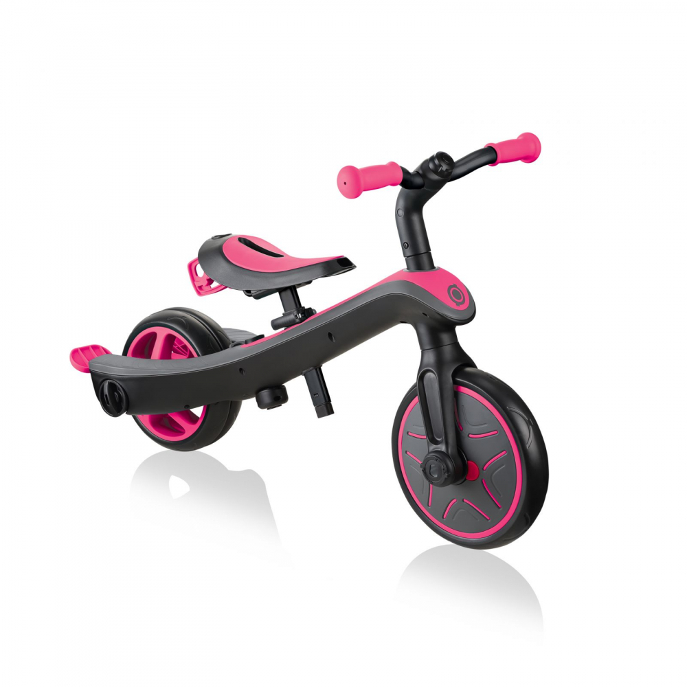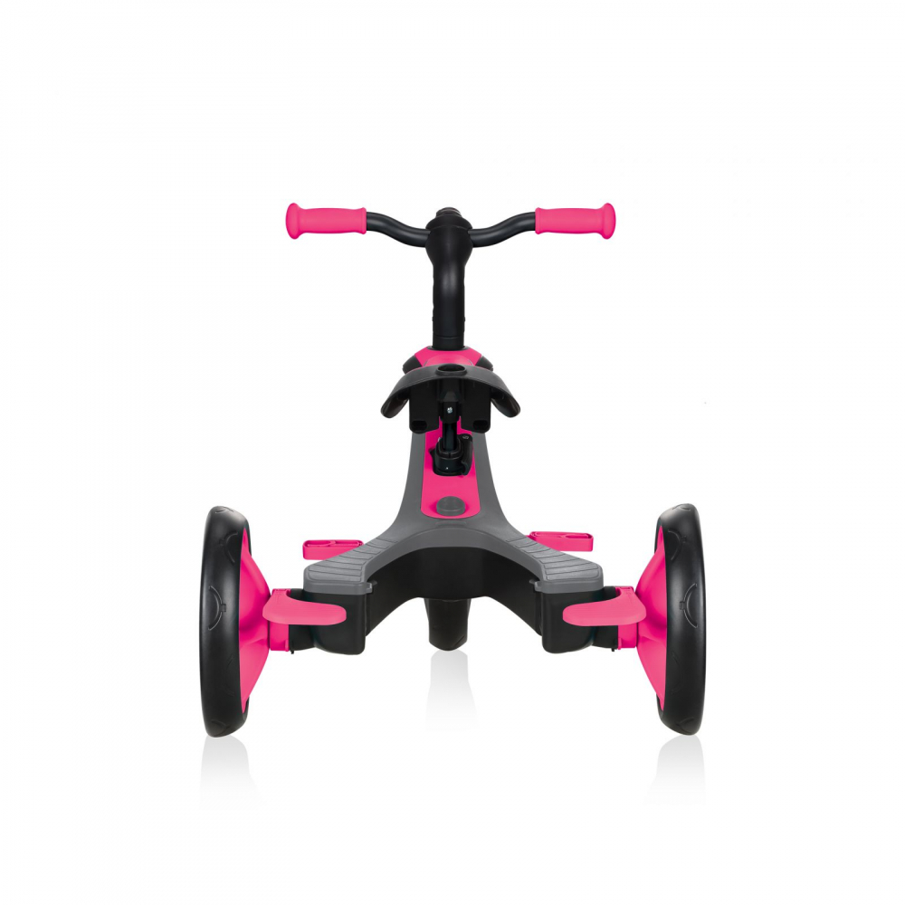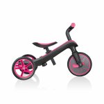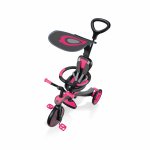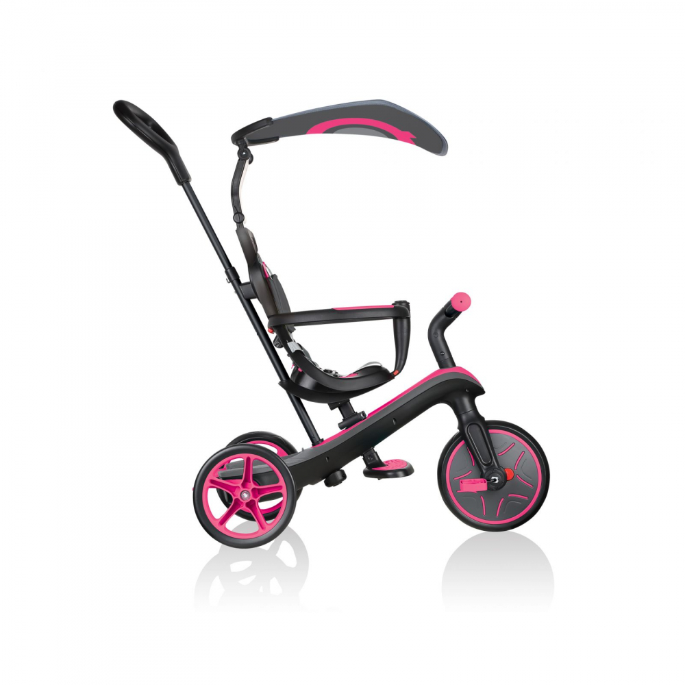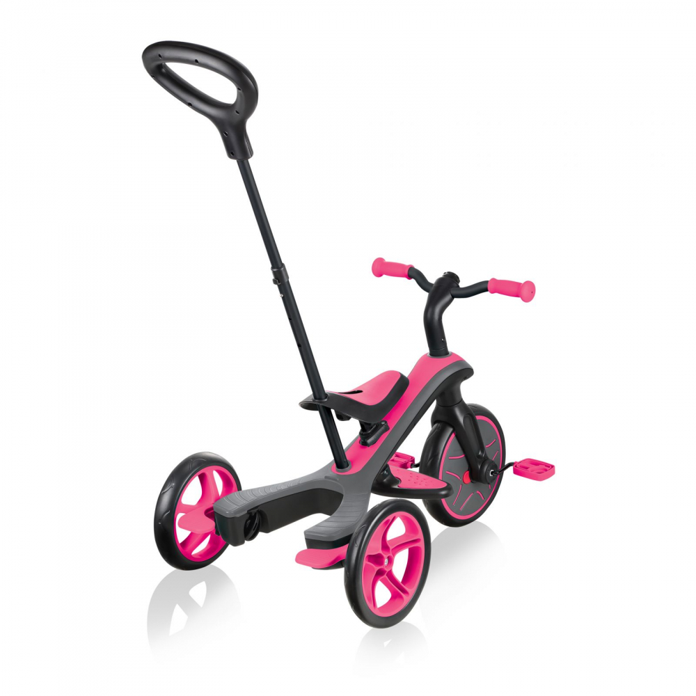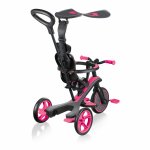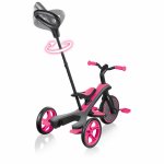 Tricicleta pentru copii Globber Explorer 4 in 1 Roz cu control parental, de la 10 luni, parasolar anti UV ajustabil, suport de picioare detasabil, scaun ajustabil pe inaltime