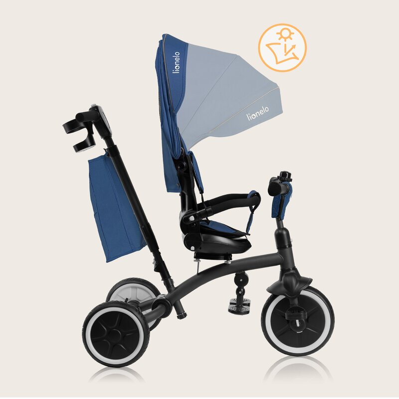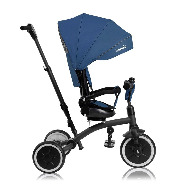 Tricicleta pentru copii Lionelo Tris Plus Albastru Ultrapliabila, Multifunctionala, Pana la 25 kg, Inclinare spatar in fata si in spate, Suport picioare, Control al directiei, Scaun reversibil, Rotire 360 grade, Conform cu EN71