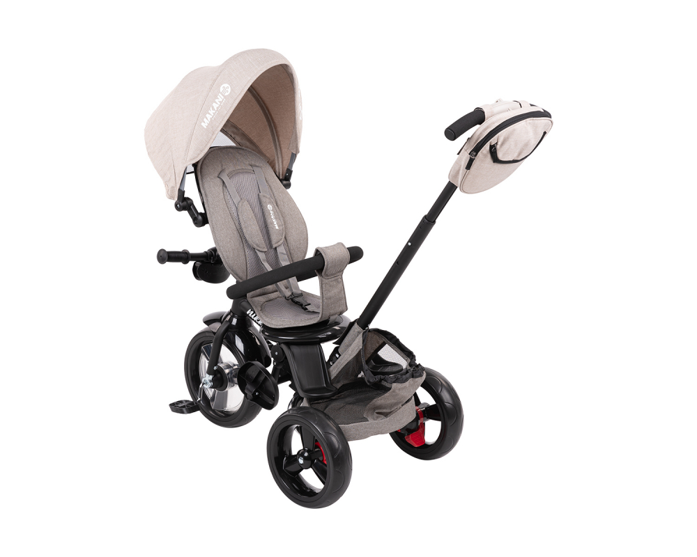 Tricicleta pentru copii Makani Nikki Beige Melange multifunctionala, pliabila, cu sezut reversibil, cu spatar reglabil cu husa moale, sistem roata libera, suport pentru picioare si roti din cauciuc eva