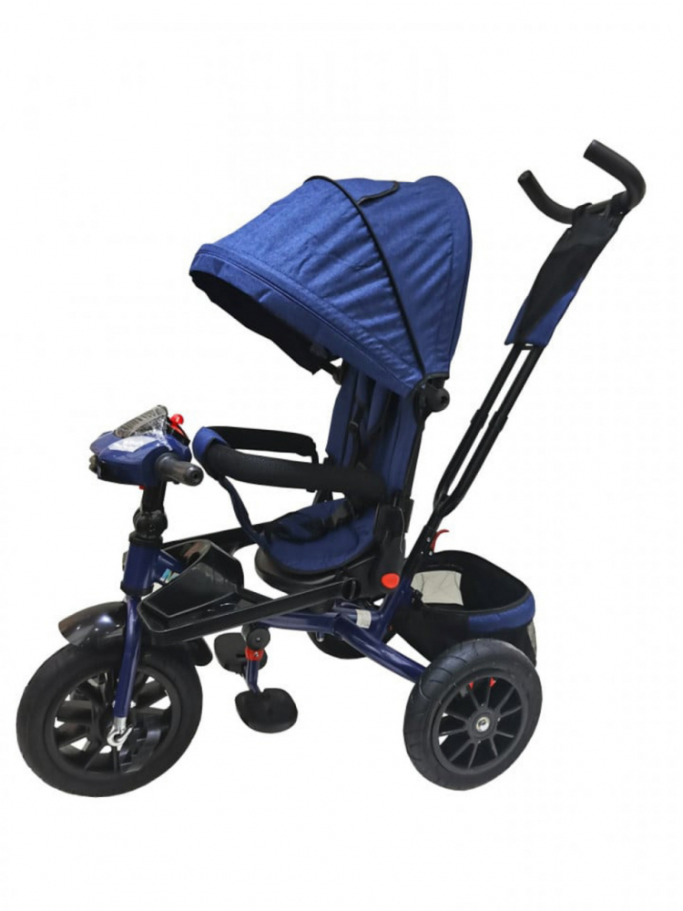 Tricicleta pentru copii Novokids Super Trike Albastru Jeans cu copertina, melodii si lumini, roti din cauciuc, pozitie somn, scaun reversibil cu rotatie 360 grade