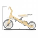 - Dimensiuni: lungime 67 cm; latime (versiunea cu trei roti) 46 cm; inaltime (sa) 31-37 cm; distanta dintre roti (modul tricicleta): 45 cm; distanta dintre roti (modul bicicleta): 8 cm;