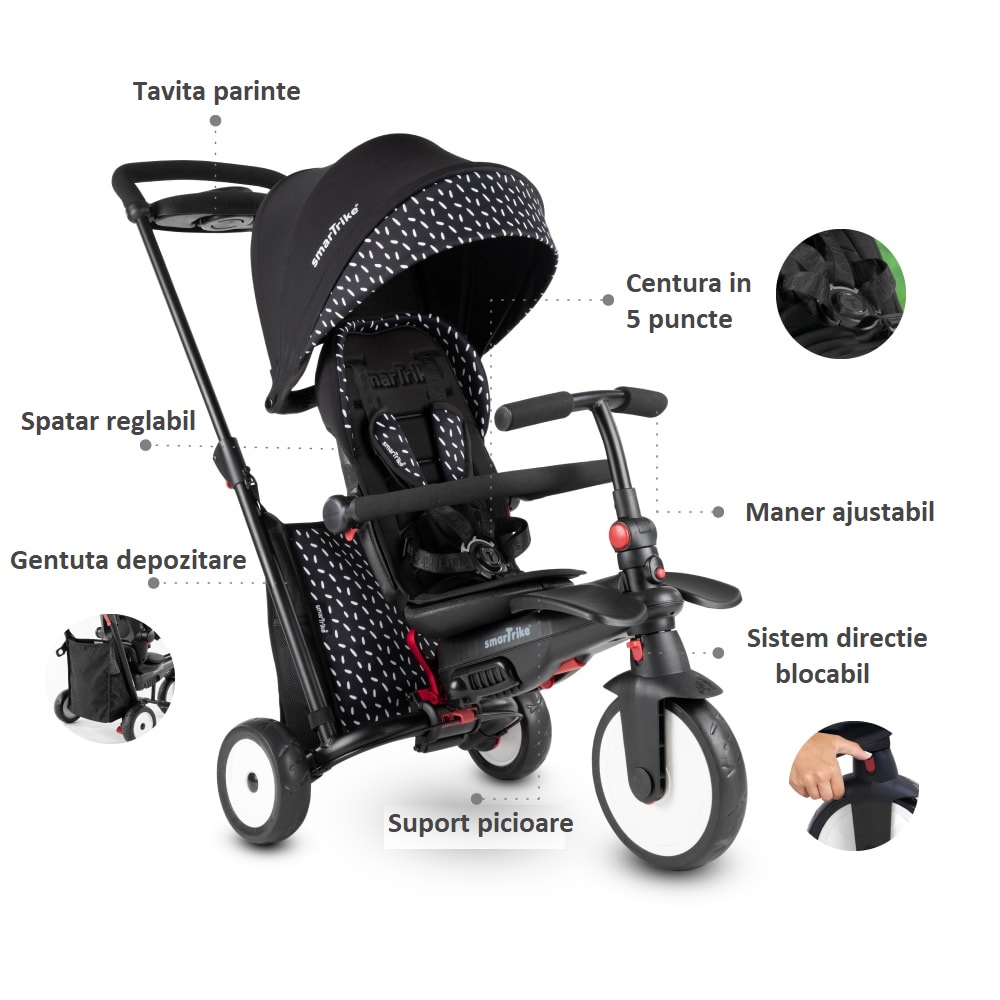 Tricicleta pentru copii Smart Trike STR5 Black/White 7 in 1, ultrapliabila, dotata cu frana, scaun rabatabil, de la 6 luni, sistem patentat cu tehnologie Touch Steering