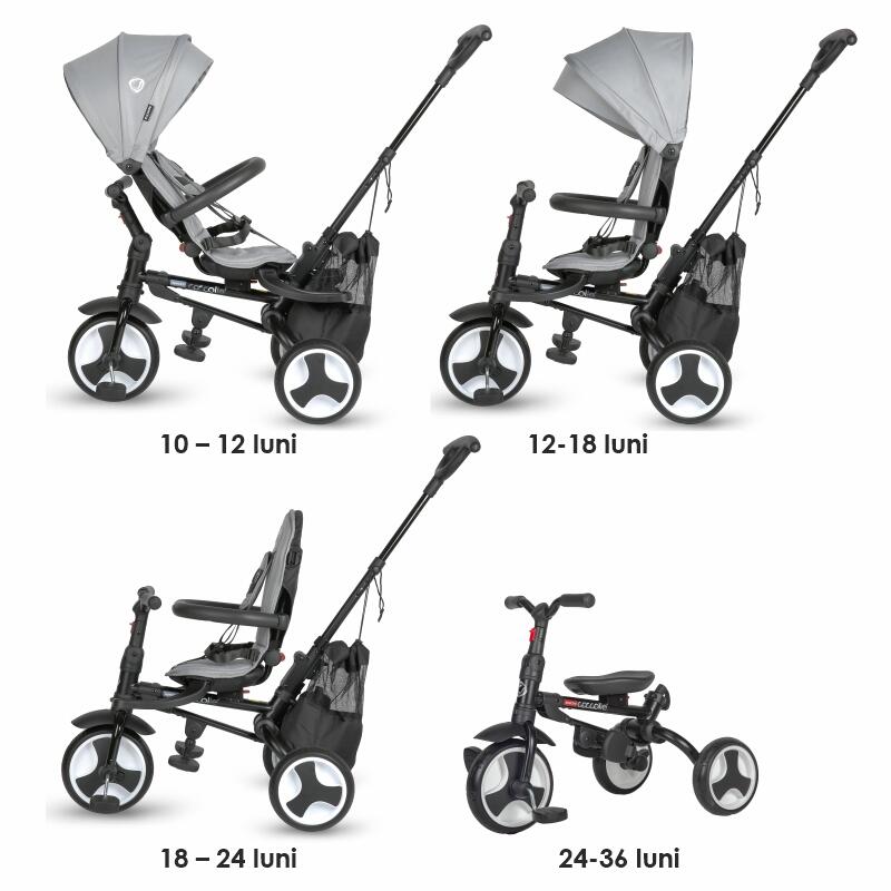 - Multifunctionala: se poate folosi de la 10 luni la 3 ani - cu toate accesoriile incluse; iar in modul tricicleta clasica, se poate folosi chiar si pana la 5 ani in functie de constitutia copilului