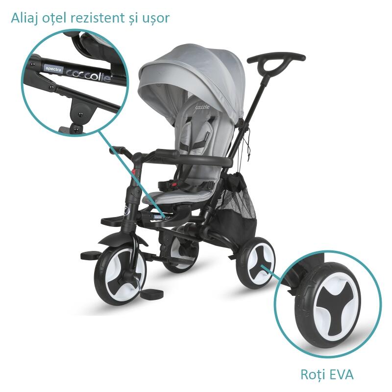 Tricicleta ultrapliabila Coccolle Spectra Plus Premium Line, Scaun reversibil, Copertina XXL, Cos accesorii, 2 seturi suport picioruse, Sistem roata libera, Roti cauciuc EVA, Neutral Grey