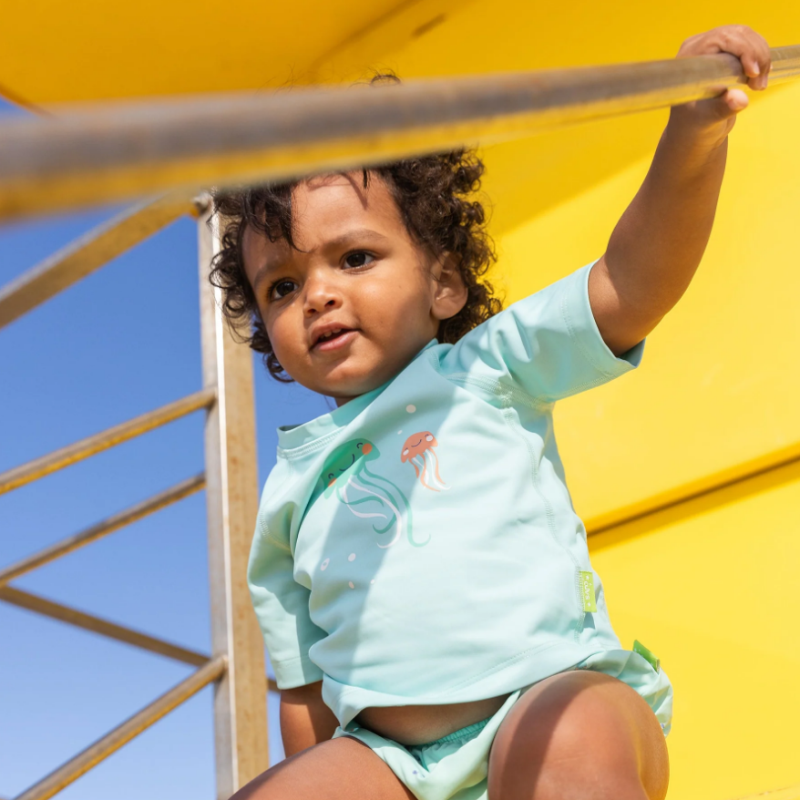 Acest tricou cu protecție solară UPF 50+ UV îl va proteja pe micuțul tău în zilele însorite la plajă și la piscină.