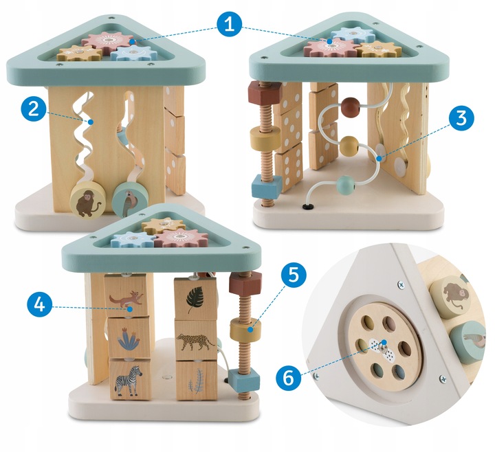 Triunghi educational din lemn Nukido NK-860 cu activitati, abac, roti cu angrenaje mobile, circuit cu bile, 18.5x17 cm