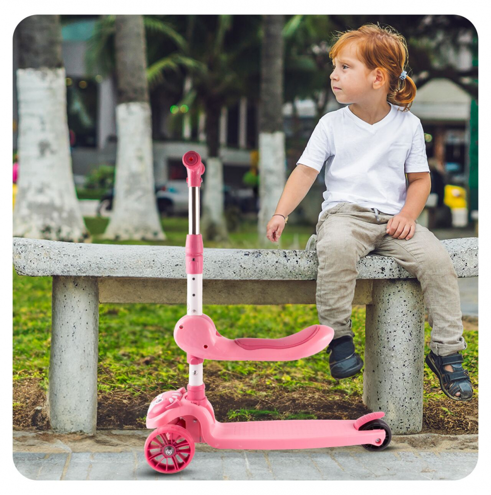 - Doua in unu: Transforma trotineta cu un simplu click! Scaunelul detasabil permite atat mersul in picioare, cat si asezat, pentru o versatilitate maxima.