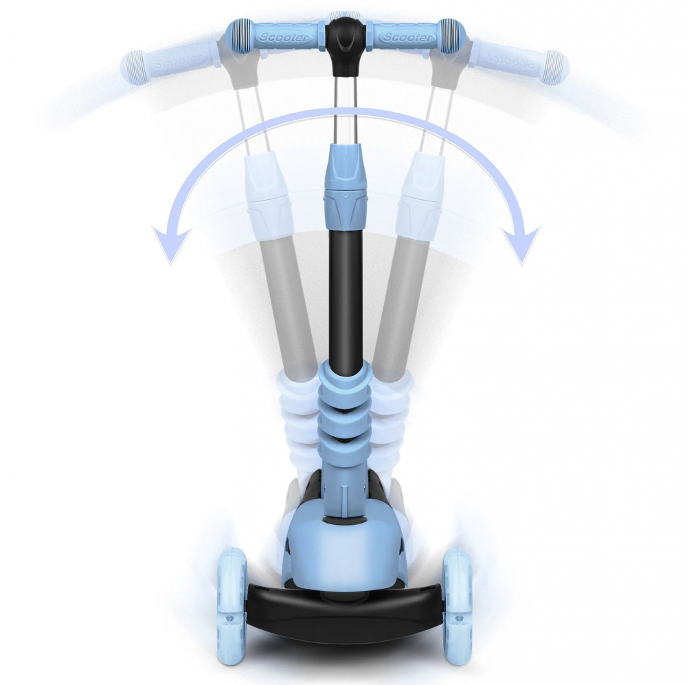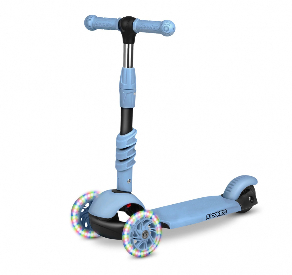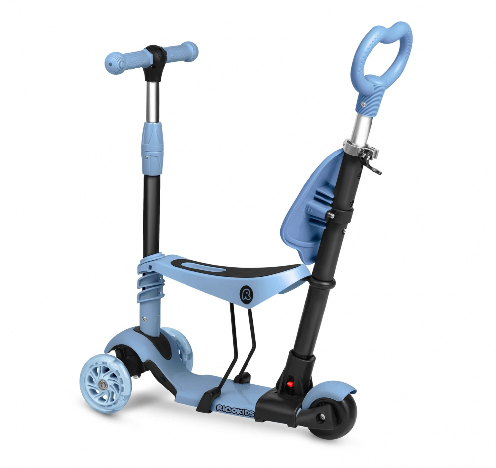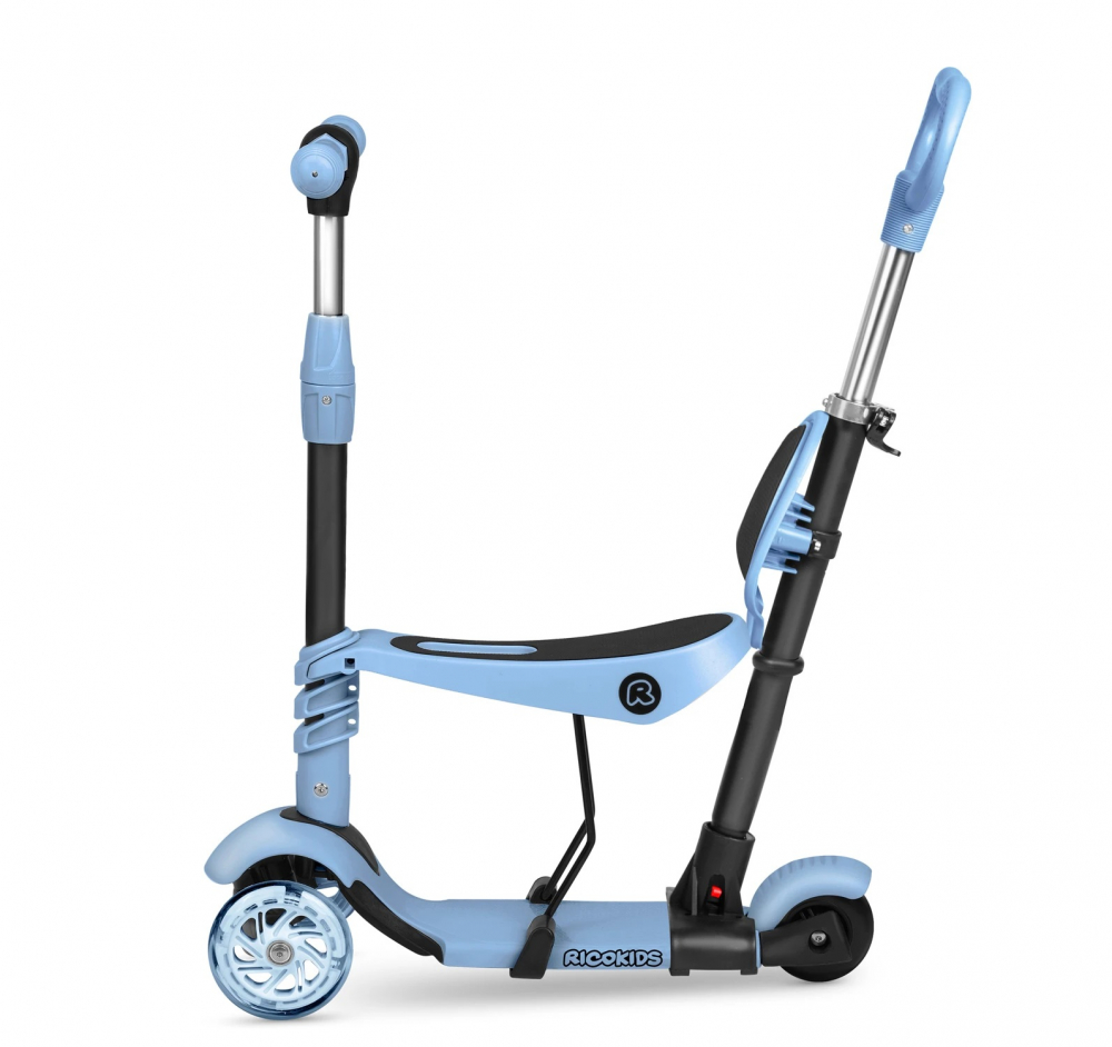 Trotineta 4 in 1 pentru copii Ricokids Todi Albastru, scaunel reglabil cu spatar,maner parental detasabil, inaltime ghidon reglabila, roti cu lumini LED, platforma antiderapanta, cadru din aluminiu, manere ergonomice