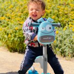 - Copilul atinge cu picioarele podeaua, impingand (din pozitia asezat) trotineta in fata si in spate.