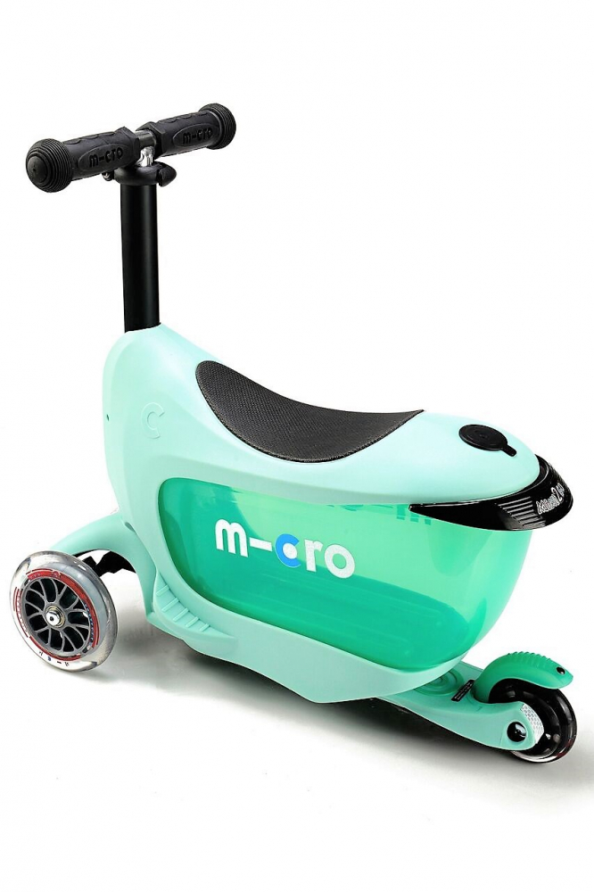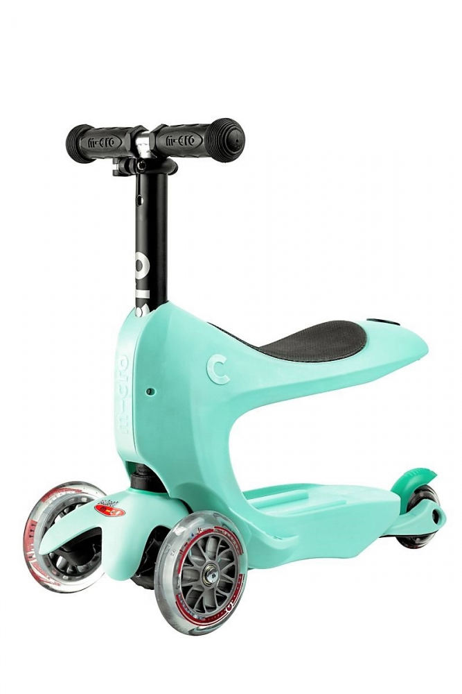 Trotineta Micro Mini2go Deluxe Mint cu 3 roti, scaunel, spatiu depozitare, ghidon telescopic, roti din silicon, greutate admisa 50 kg