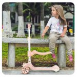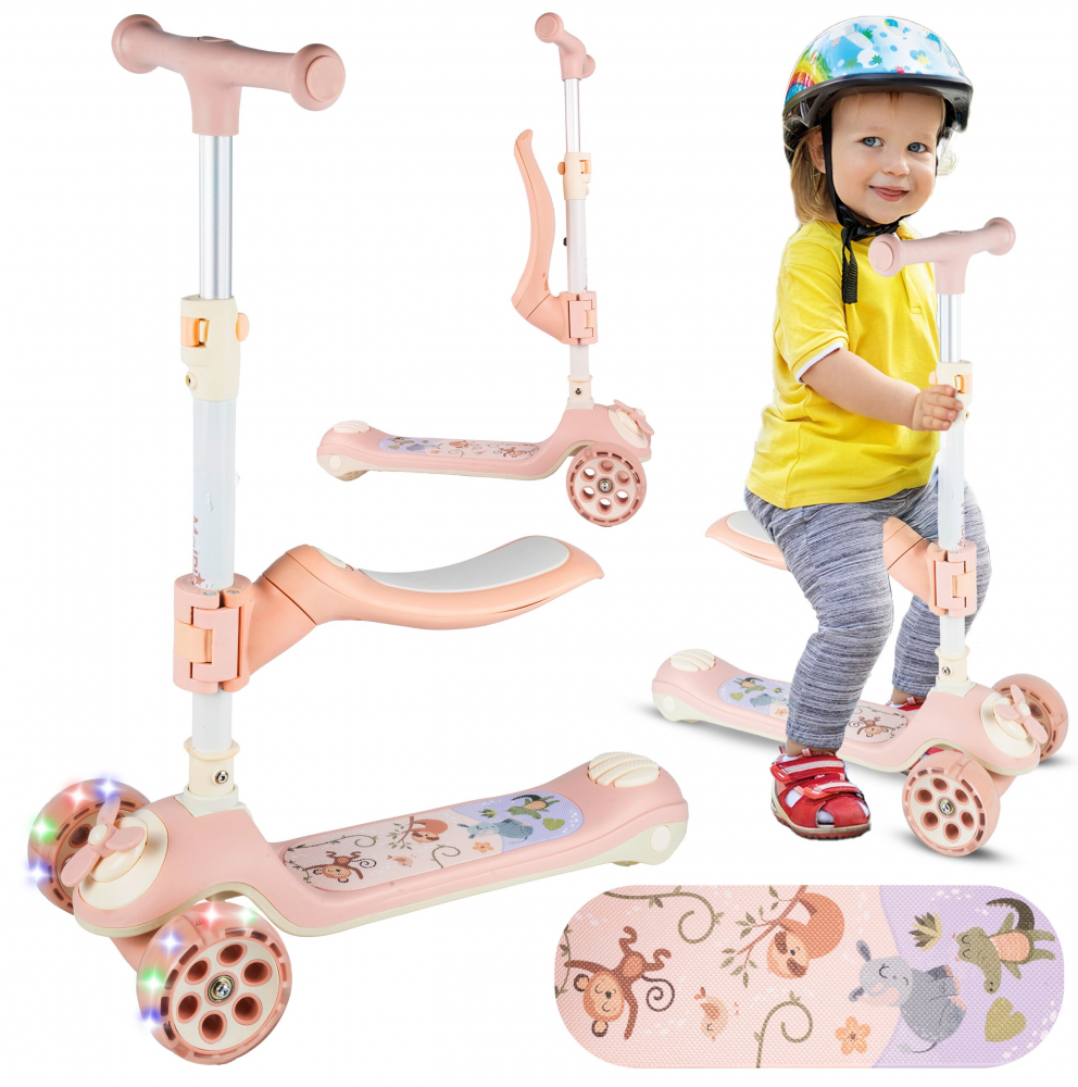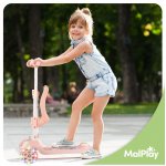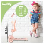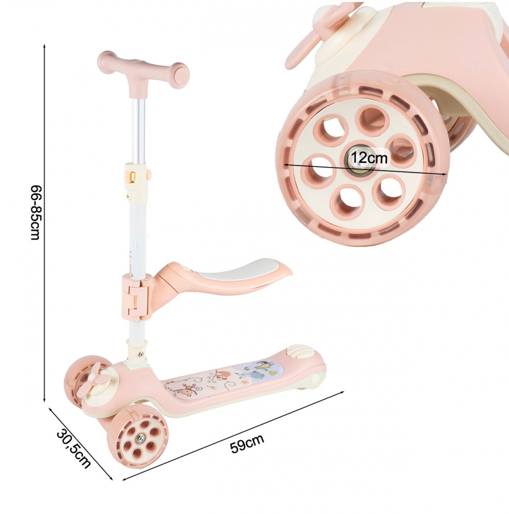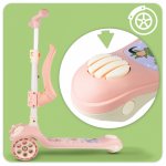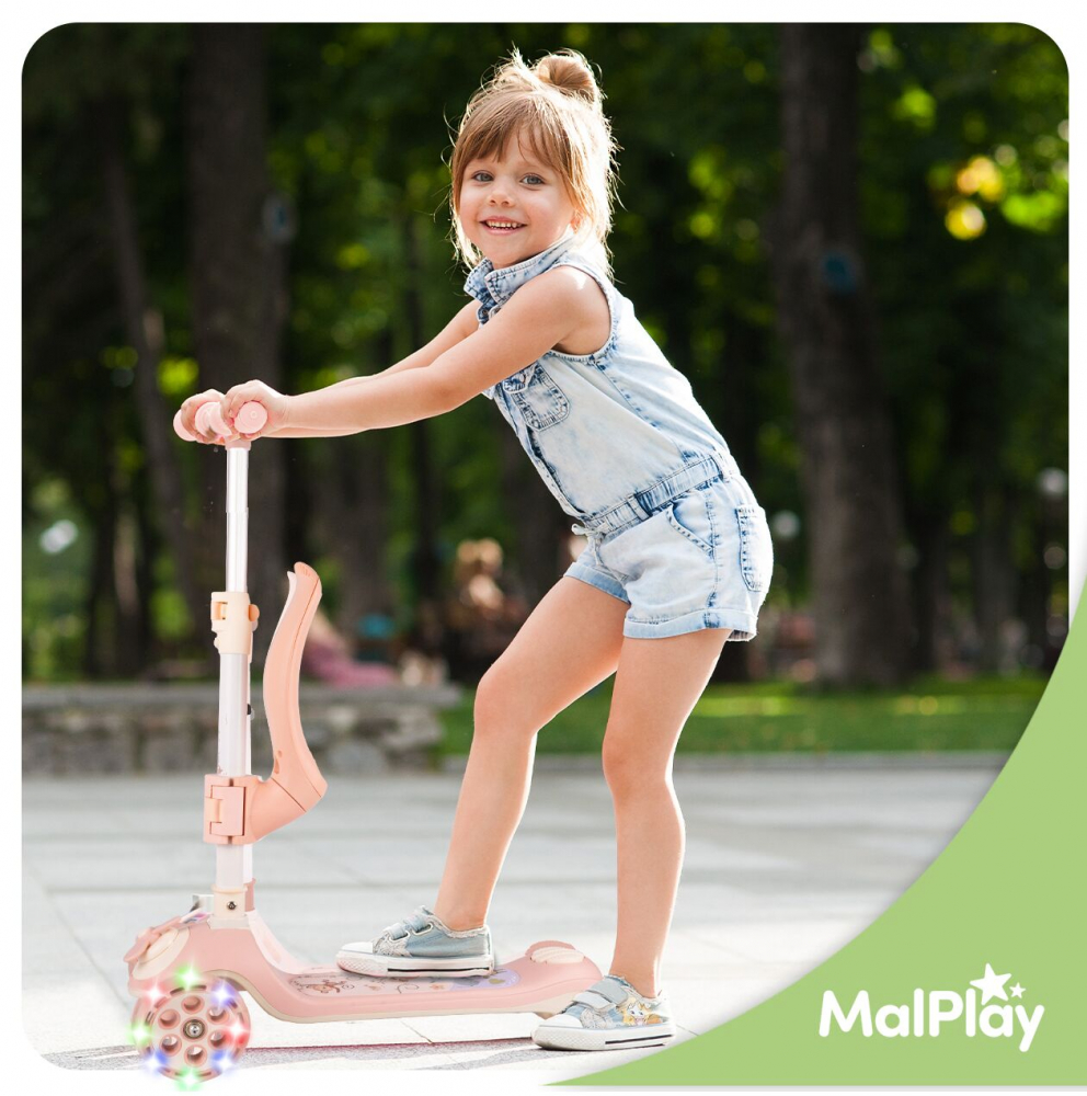 Trotineta pentru copii, Malplay, pliabila, 3 in 1, scaunel detasabil, roti din PU cu lumini Led, punte antiderapanta si frana de picior, ghidon reglabil pe inaltime, manere ergonomice, elice rotativa, 59 x 30.5 x 66 cm, Pink
