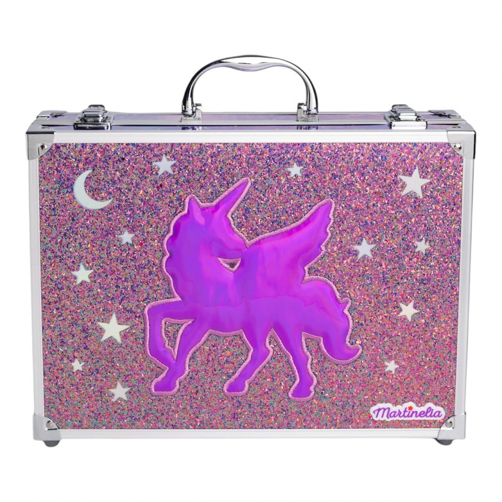 Trusa de machiaj pentru fetițe tip servietă Galaxy Dreams de la Martinelia (cod 12069) este un set complet de produse cosmetice, ideal pentru micile iubitoare de machiaj. Această trusă cu tematica galaxiei Pegasus este ambalată într-o servietă atrăgătoare și conține tot ce au nevoie copiii pentru a experimenta cu culori și texturi diferite, stimulând creativitatea într-un mod sigur.