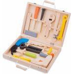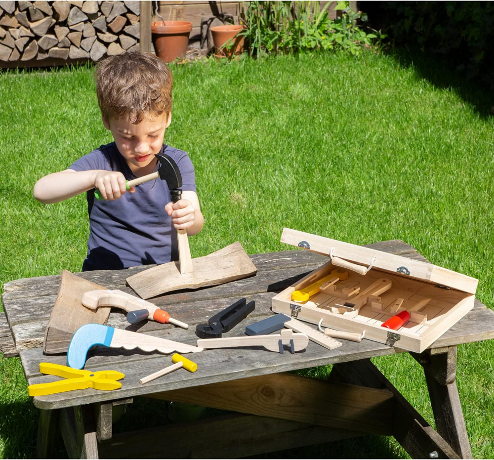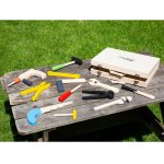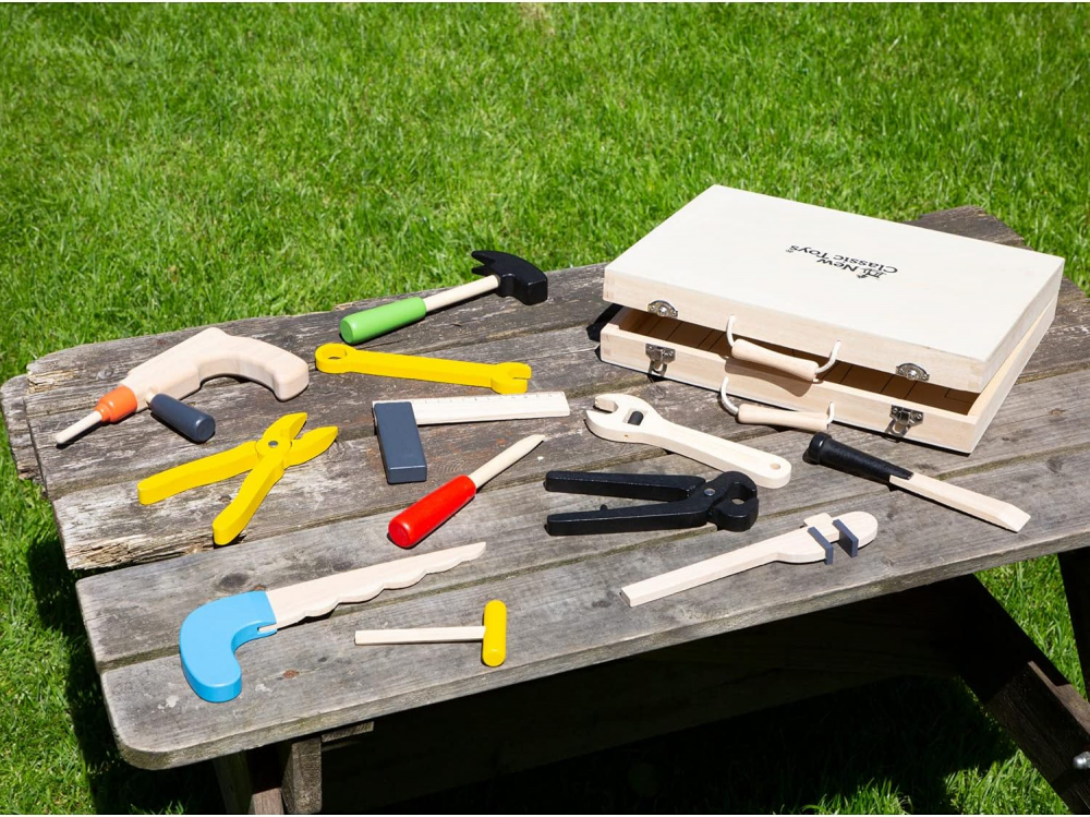 Aceasta minunata trusa de scule din lemn masiv contine 12 instrumente esentiale: o surubelnita, o rigla patrata, o dalta, 3 chei, un patent, un fierastrau, un cleste pentru cuie, un ciocan, o surubelnita hexagonala si o masina de gaurit.