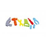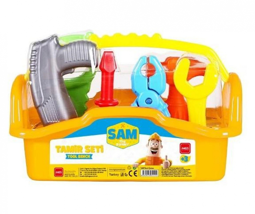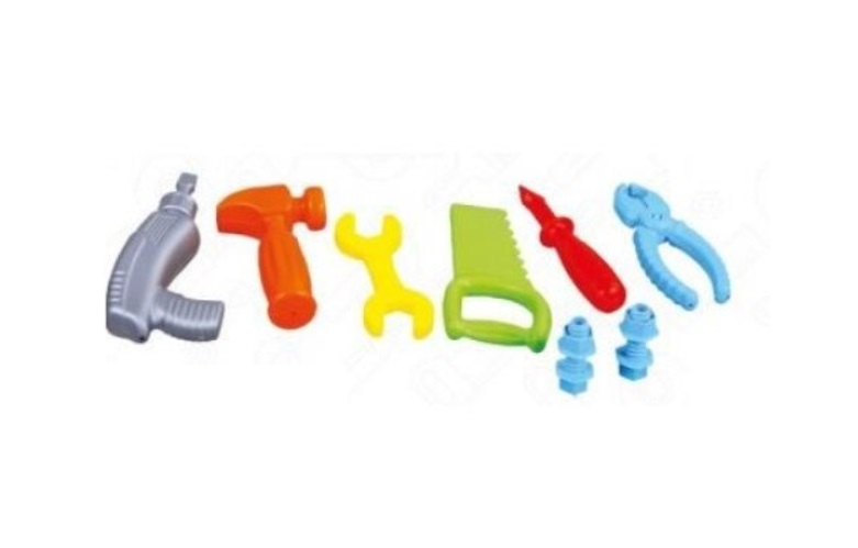 Setul include 8 piese: un ciocan, un fierastrau, o cheie fixa, un patent, o surubelnita, o bormasina, suruburi.