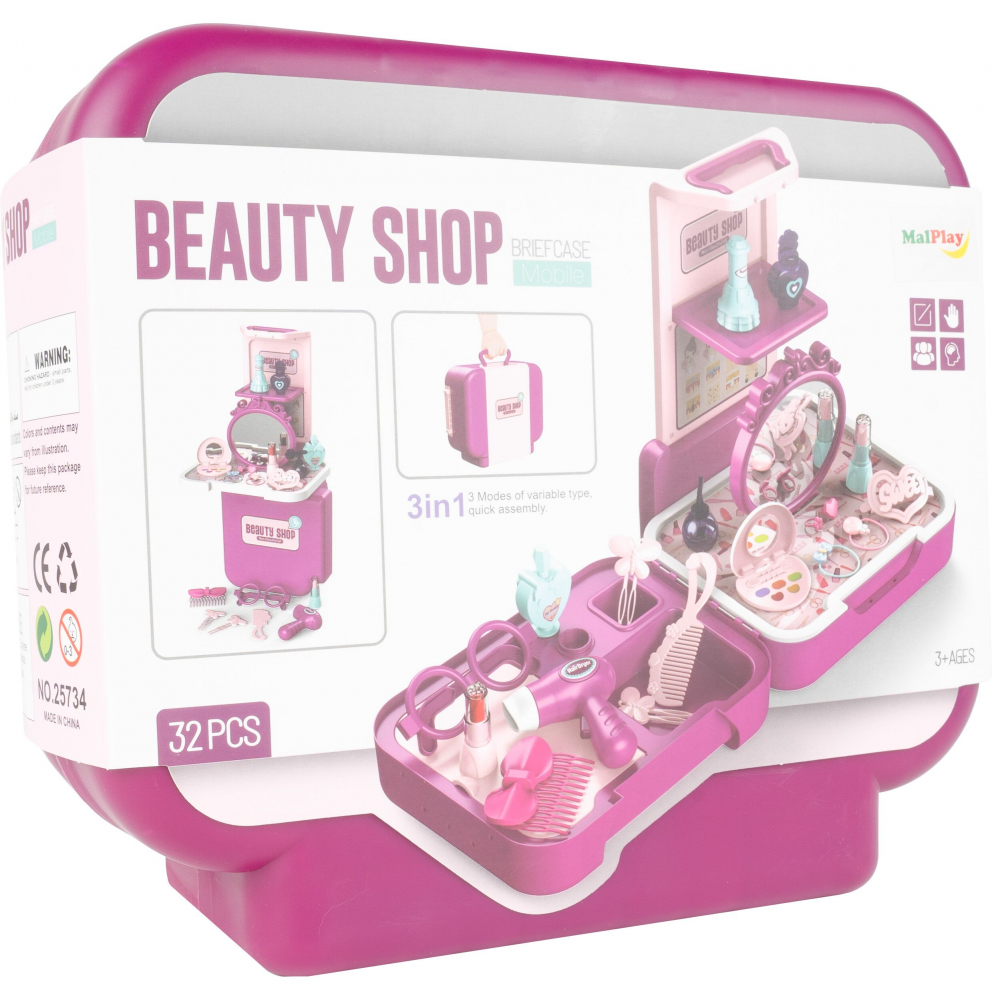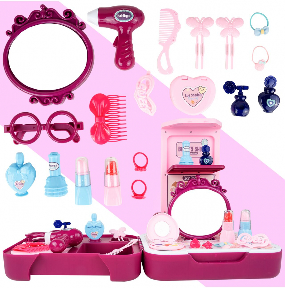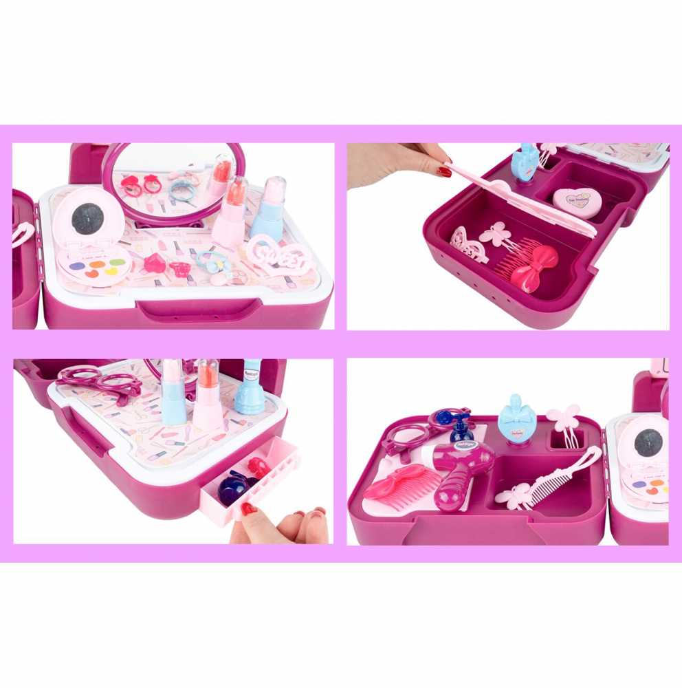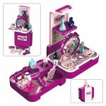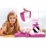 * Un set bogat de frumusețe sub forma unui cufăr pliant conține o mulțime de accesorii care cu siguranță vor mulțumi fiecare domnișoară. Are multe ustensile care sunt necesare în fiecare salon de înfrumusețare, cum ar fi un pieptene, podoabe pentru păr, farduri de ochi, uscător de păr și multe altele. Cu ajutorul lor, o mică prințesă poate deveni un zeu în cel mai scurt timp! Pieptul nostru poate fi folosit în trei moduri diferite: