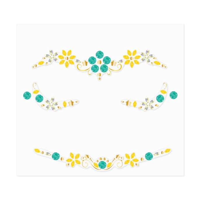 Conținut – 9 șabloane, 3 vopsele pentru față, 2 autocolante pentru cercei, 1 bijuterie pentru față și 1 bijuterie pentru colier.