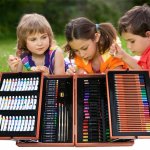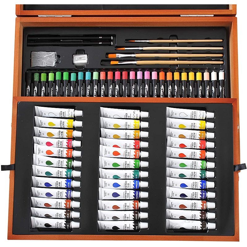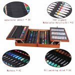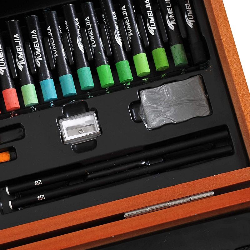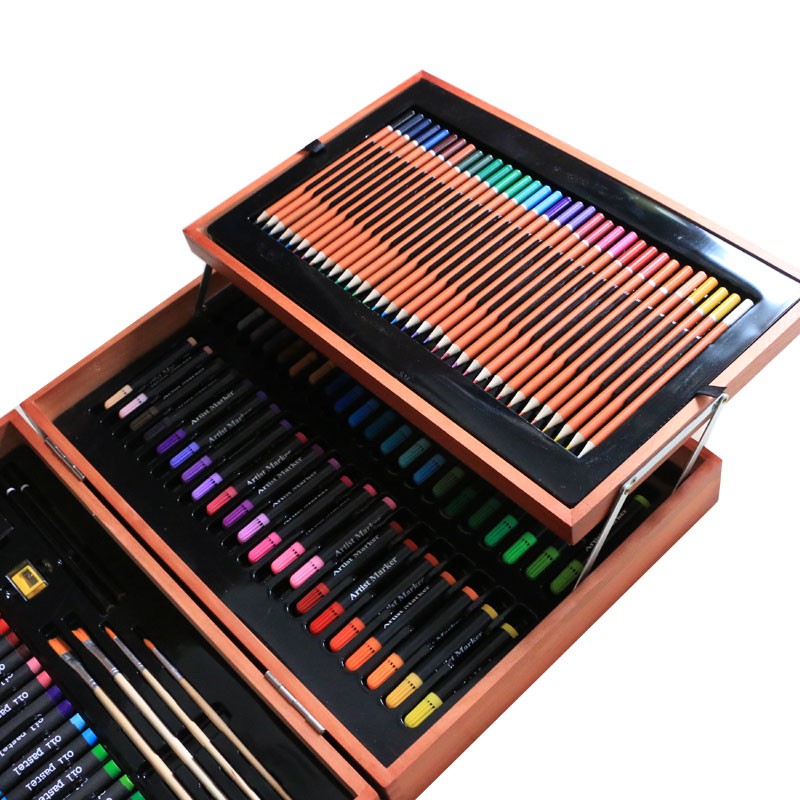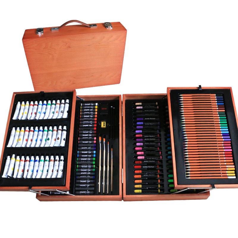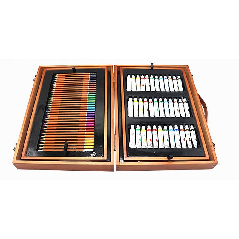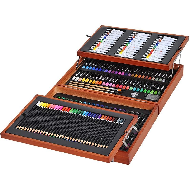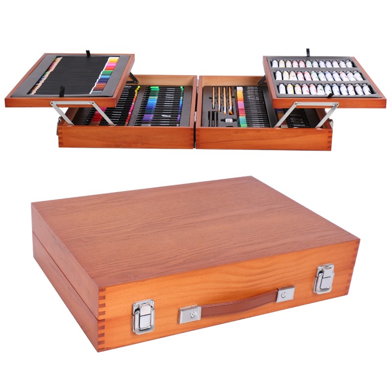 Trusa pictura si desen 174 piese, cutie lemn, 4 compartimente