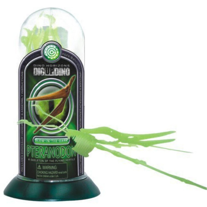 O parte din fascinanta lumea disparuta a dinozaurilor este surprinsa de continutul acestui tub: scheletul unui dinozaur de 18cm, fosforescent, din plastic, specia Parasaurolophus si Pteranodon.