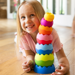 Turn de bile pentru stivuit și echilibru combină culori vesele cu fizica mișcării și o textură tactilă unică, oferind copiilor o experiență senzorială completă.