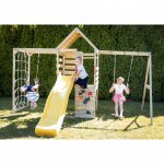Modulul de gimnastica are suficient spatiu pentru pana la trei copii care pot explora plasa de catarare, inelele de gimnastica si barele de maimuta.