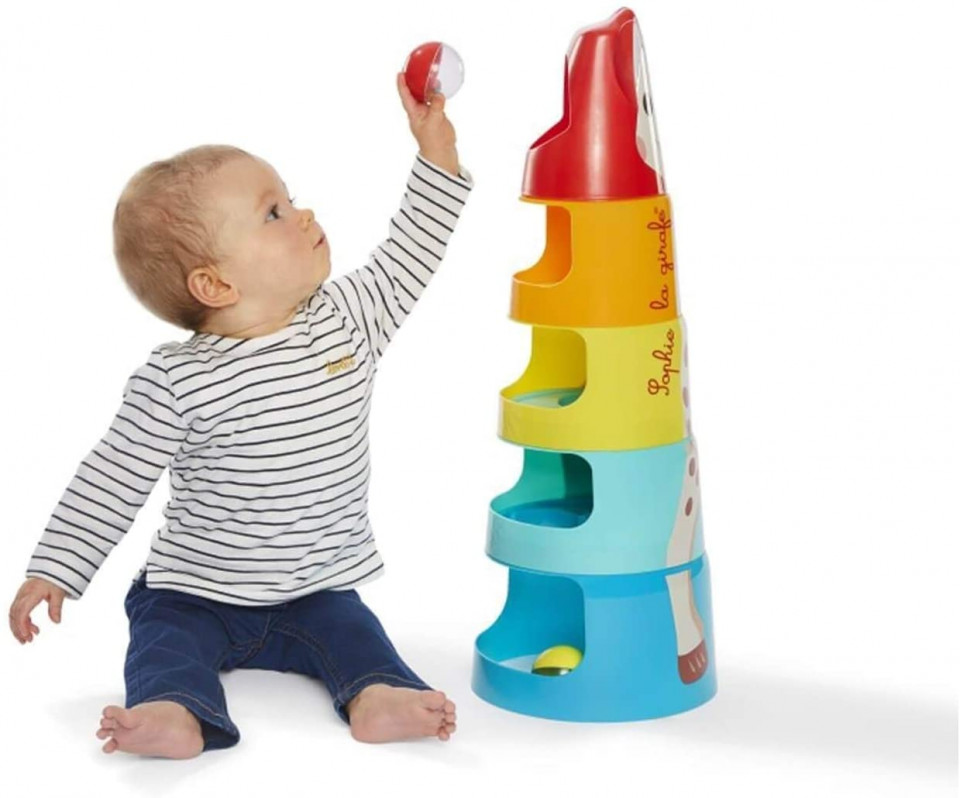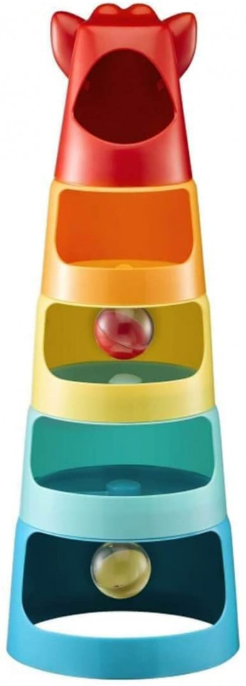 Joc cu bile: 2 bile pentru a le pune in varful turnului si care vor aluneca una cate una datorita toboganului magic. Diferitele culori sunt excelente pentru stimularea vizuala.