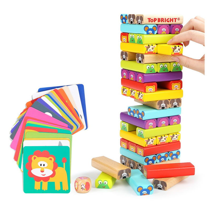 • Setul include: 51 piese din lemn in culori vibrante , imprimate la capete cu figuri vesele de animalute, 24 de carduri, 1 zar si instructiuni de joc.