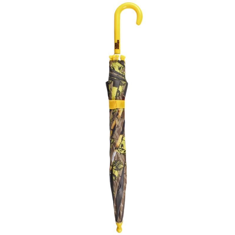 Umbrela manuala 42 cm - Minions este un accesoriu dragut, perfect contra zilelor ploioase. Sistemul de inchidere si deschidere al acestei umbrele este foarte practic si usor de folosit, prin simpla manevrare a suportului de spite. Cupola arcuita a acestei umbrele protejeaza utilizatorul de ploaia laterala si vant. Umbrela se strange cu ajutorul unei panglici cu scai. Culoriile vesele si desenele cu bine-cunoscutele personaje din desenele animate Minions, o sa va insenineze ziua. Manerul in forma de baston este usor de tinut in mana si poate fi agatat de orice suport.