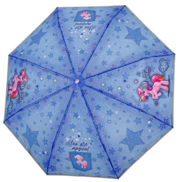 Intra in lumea de vis a unicornilor mergand in ploaie cu aceasta umbrela originala.Fundalul denim si imprimeul unui unicorn roz il fac un accesoriu la moda.