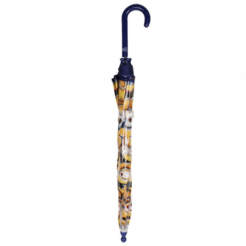 Umbrela transparenta copii - Minions Grup este un accesoriu dragut, perfect contra zilelor ploioase. Sistemul de inchidere si deschidere al acestei umbrele este foarte practic si usor de folosit, prin simpla manevrare a suportului de spite. Umbrela se strange cu ajutorul unei panglici transparente, cu o capsa. Cupola umbrelei o sa va protejeze de ploaia laterala si vant. Culorile vesele si imaginile cu simpaticii Minioni va vor insenina ziua. Manerul in forma de baston este usor de tinut in mana si poate fi agatat de orice suport.