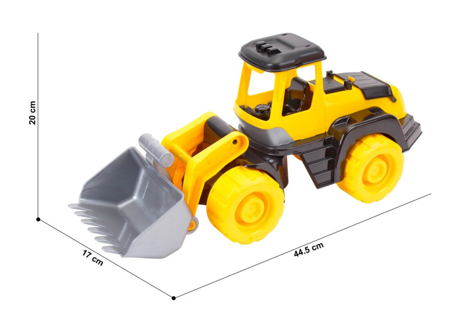 Caracteristica acestei noi jucarii este conexiunea mobila (cu balamale) a cabinei cu cupa tractorului.