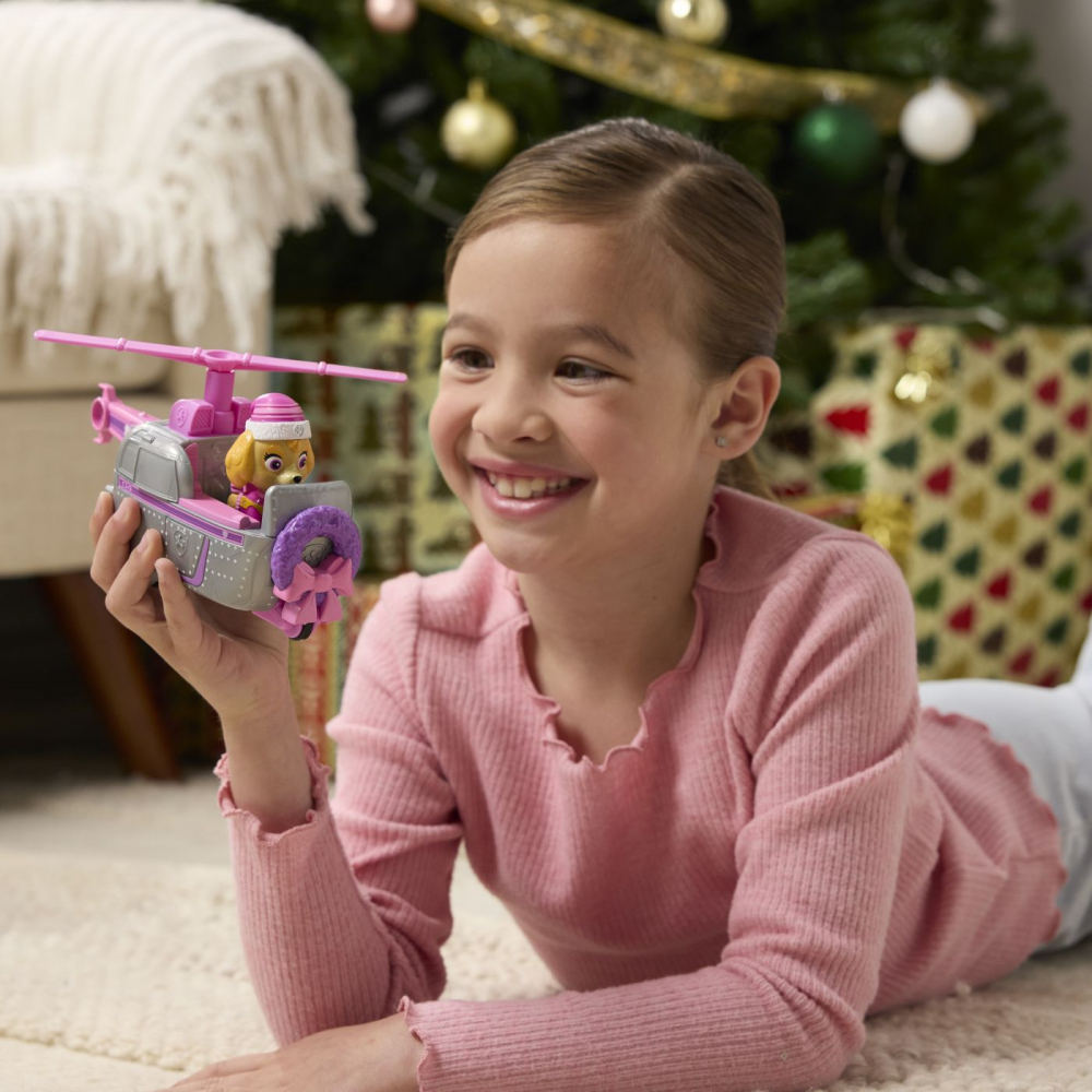 Vehicul si figurina Patrula Catelusilor Skye cu accesorii de craciun