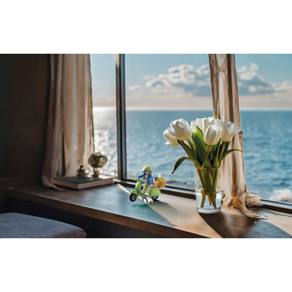 Vespa minutios conceputa este completata de o figurina PLAYMOBIL si o diversitate de accesorii.
