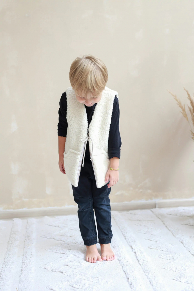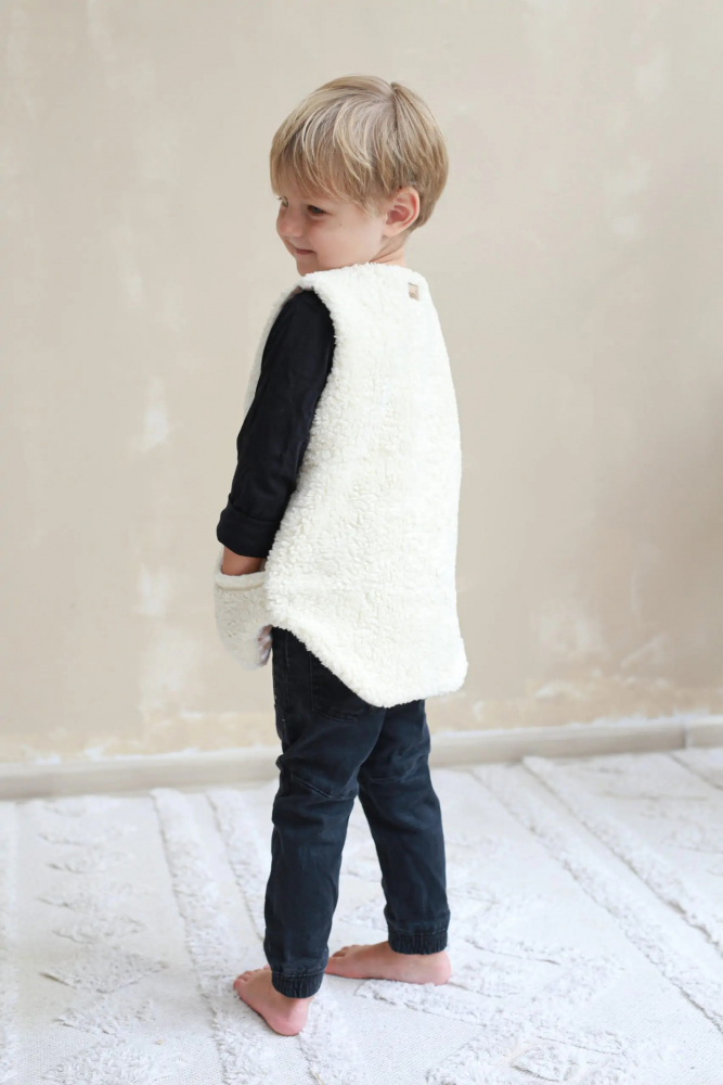 Vestă caldă, reversibilă, din tesatura bucle, tip miel și bumbac muselina.