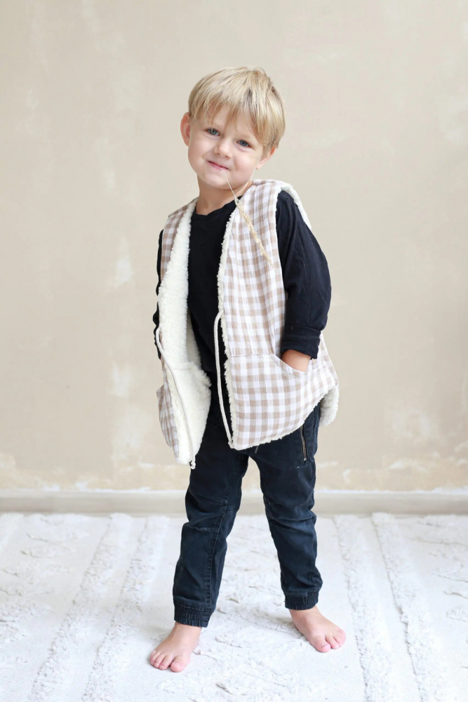 Vesta poate fi îmbrăcată în ambele variante - cu muselina in carouri sau tesatura Teddy.