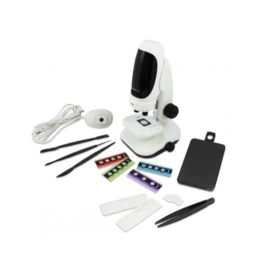 Setul contine: 1 microscop, 1 camera, 1 adaptor pentru smartphone, 1 adaptor pentru ochi (vizor), 3 unelte, 2 lamele goale, 1 penseta, 4 lamele specimen, 4 lamele transparente de acoperire, instructiuni.