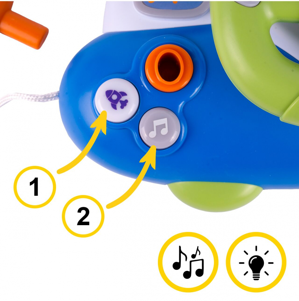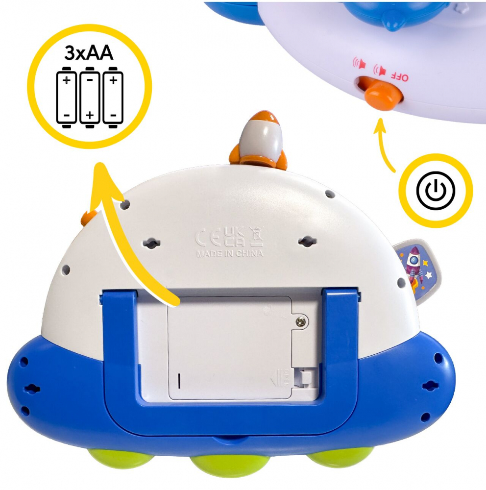 * Jucaria este echipata cu lumini care clipesc in ritmul muzicii, ceea ce atrage in plus atentia copilului.