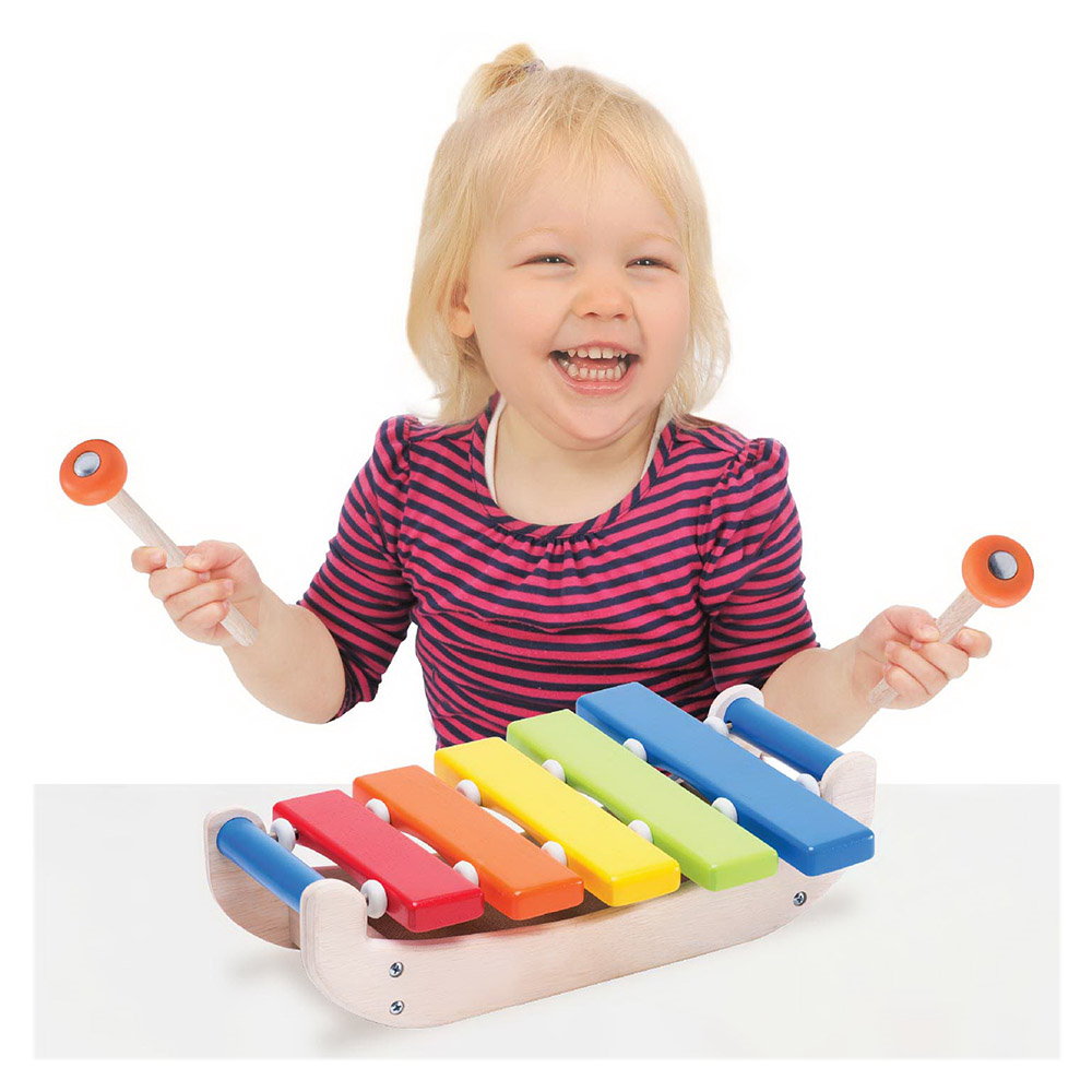 • Xilofonul vine cu 5 clape colorate din lemn masiv, care redau 5 tonuri placute, asezate pe doua corzi elastice si despartite de margele din cauciuc.