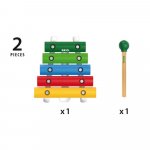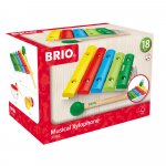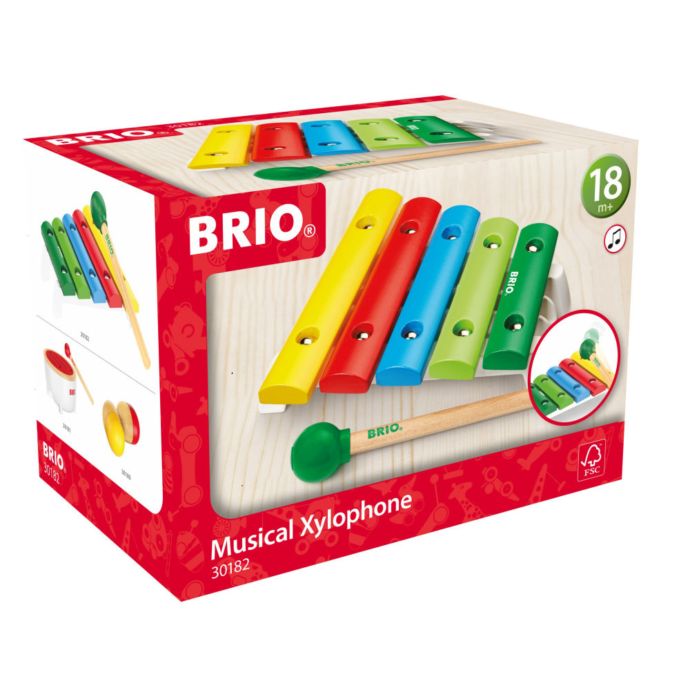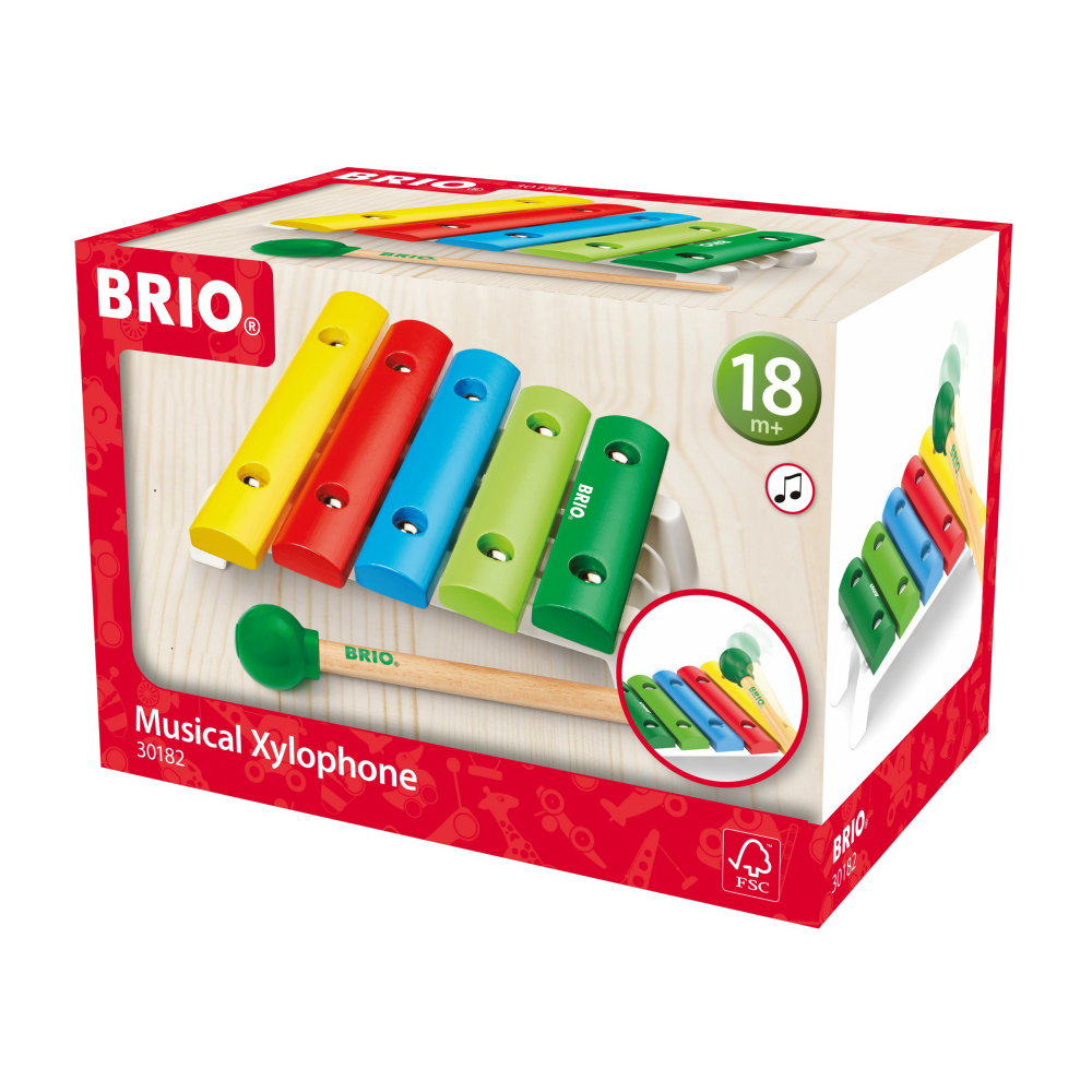 Xilofon din lemn de la BRIO are cinci tonuri diferite pentru a crea melodii noi.