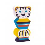 21 de piese din lemn de diferite dimensiuni si forme, ilustrate astfel încât se pot construi totemuri cu animalute.