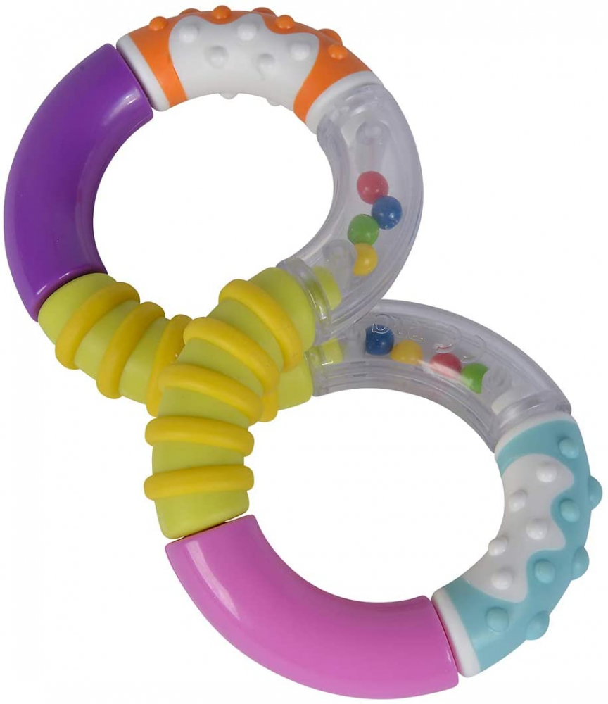• Jucarie este viu coloarata, cu mai multe tipuri de material, pentru a-i ajuta pe bebelusi pentru calmarea durerilor de dinti si bile in interiorul acesteia pentru zgomot.